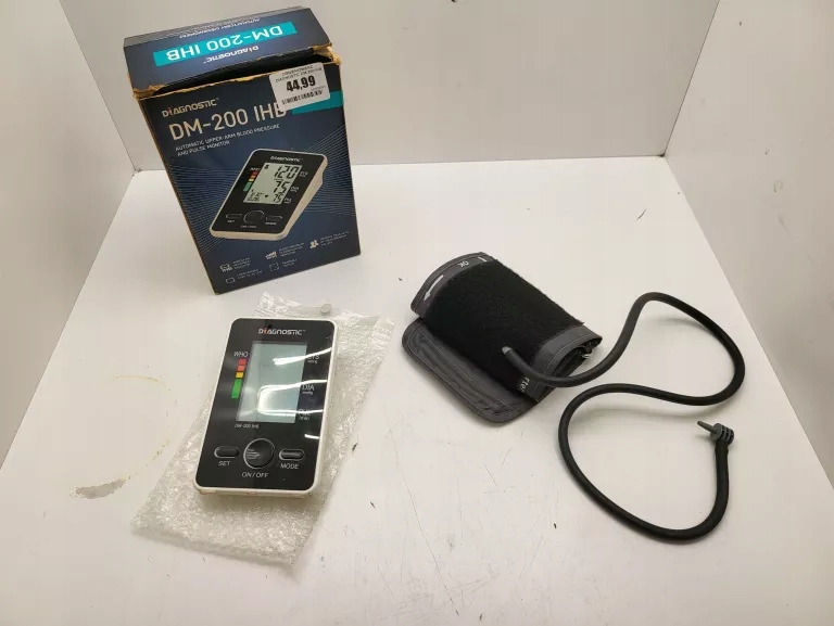 : уповноважування: Пристрій працює правильно і робить точні вимірювання, але візуально може показувати значні сліди використання або проходження часу (видно на фотографії, потенційний бруд). - Наборі включає: основний пристрій вимірювального тиску, манжету плеча та оригінальний (хоча і пошкоджений) упаковку.