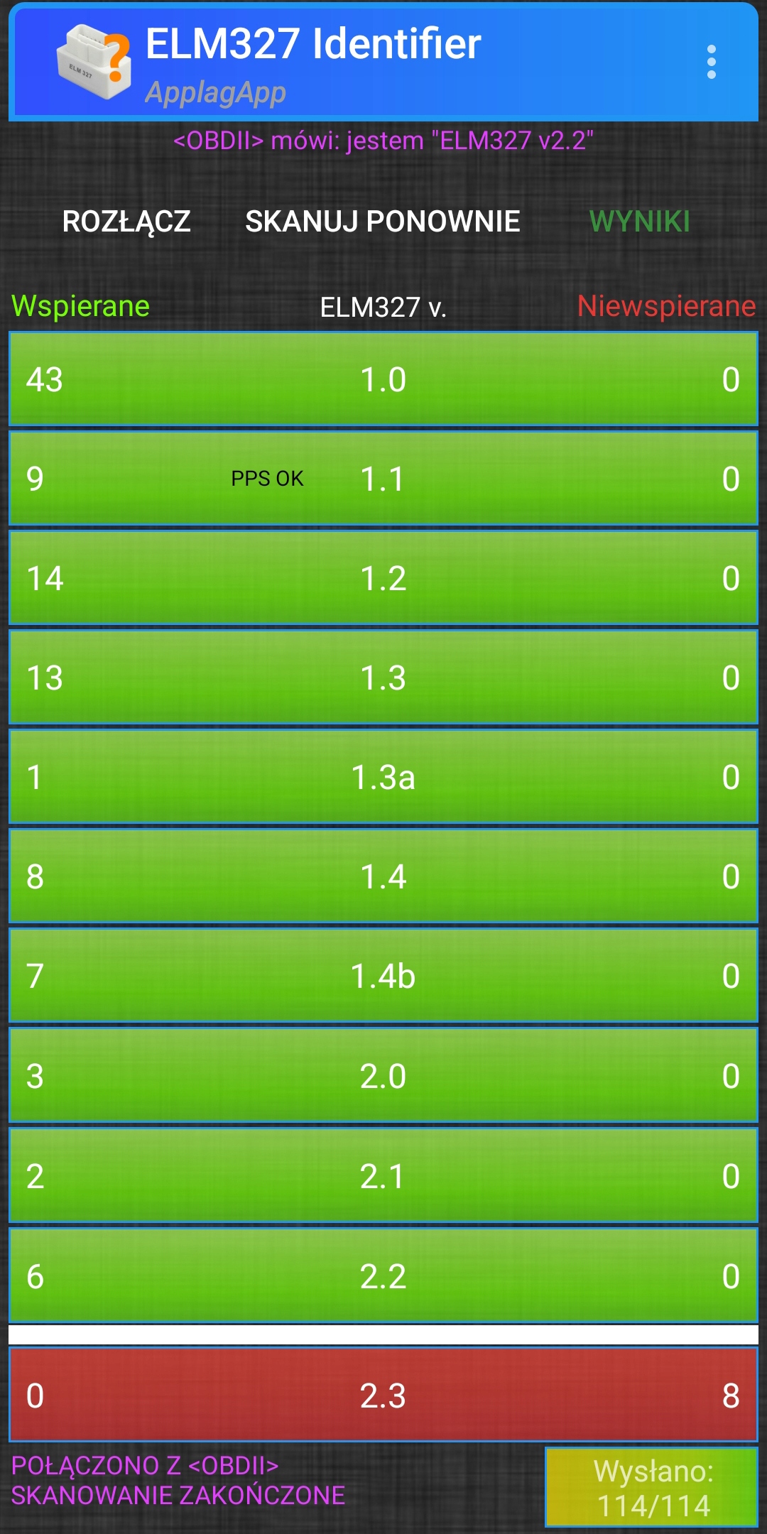 - Читання діагностичних кодів помилок, як загальних, так і специфічних для виробника, і відображення їх значення (понад 3000 загальних визначень кодів у базі даних).