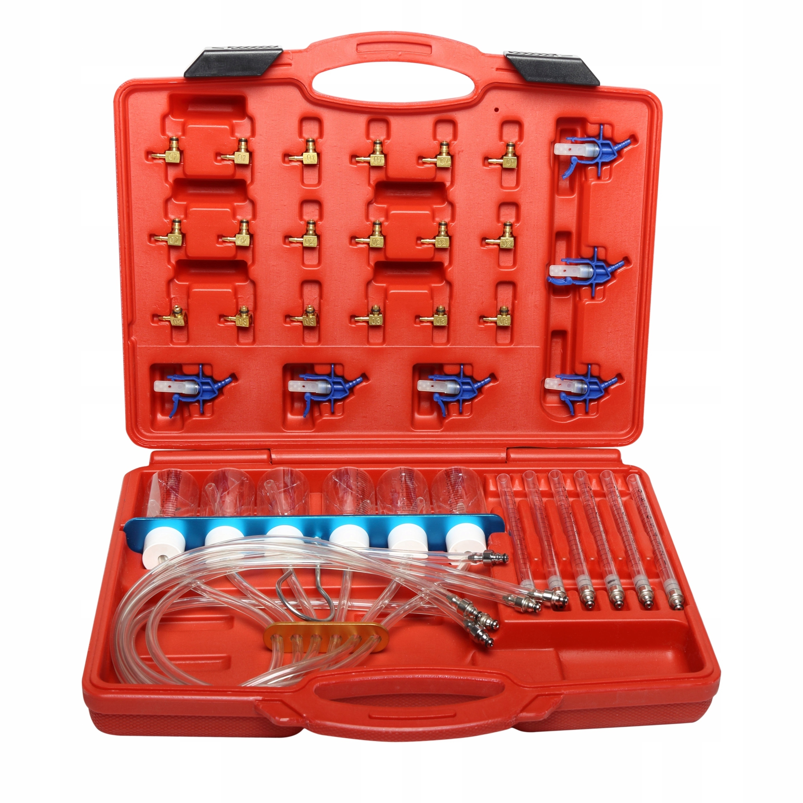 Конструкція: набір складається з 31 елемента, включаючи: чотири типи адаптерів для підключення до форсунок, шість тестерів і тест-смужку з кабелями для підключення до форсунок, розміщених у важкодоступних місцях.