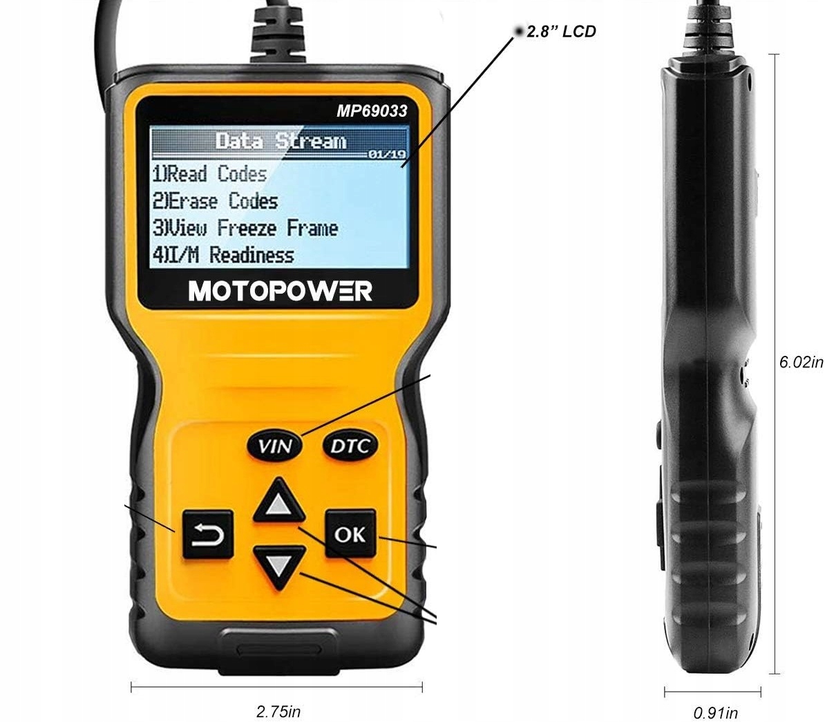 Автомобільний діагностичний сканер оснащений кабелем довжиною 0,8 м і складається з дуже товстого гнучкого ізолятора. Сканер OBD2 оснащений 6 кнопками: кнопками прокручування вгору/вниз, кнопками підтвердження/назад і кнопками, які дозволяють швидко знайти номер VIN автомобіля та отримати код помилки DTC.