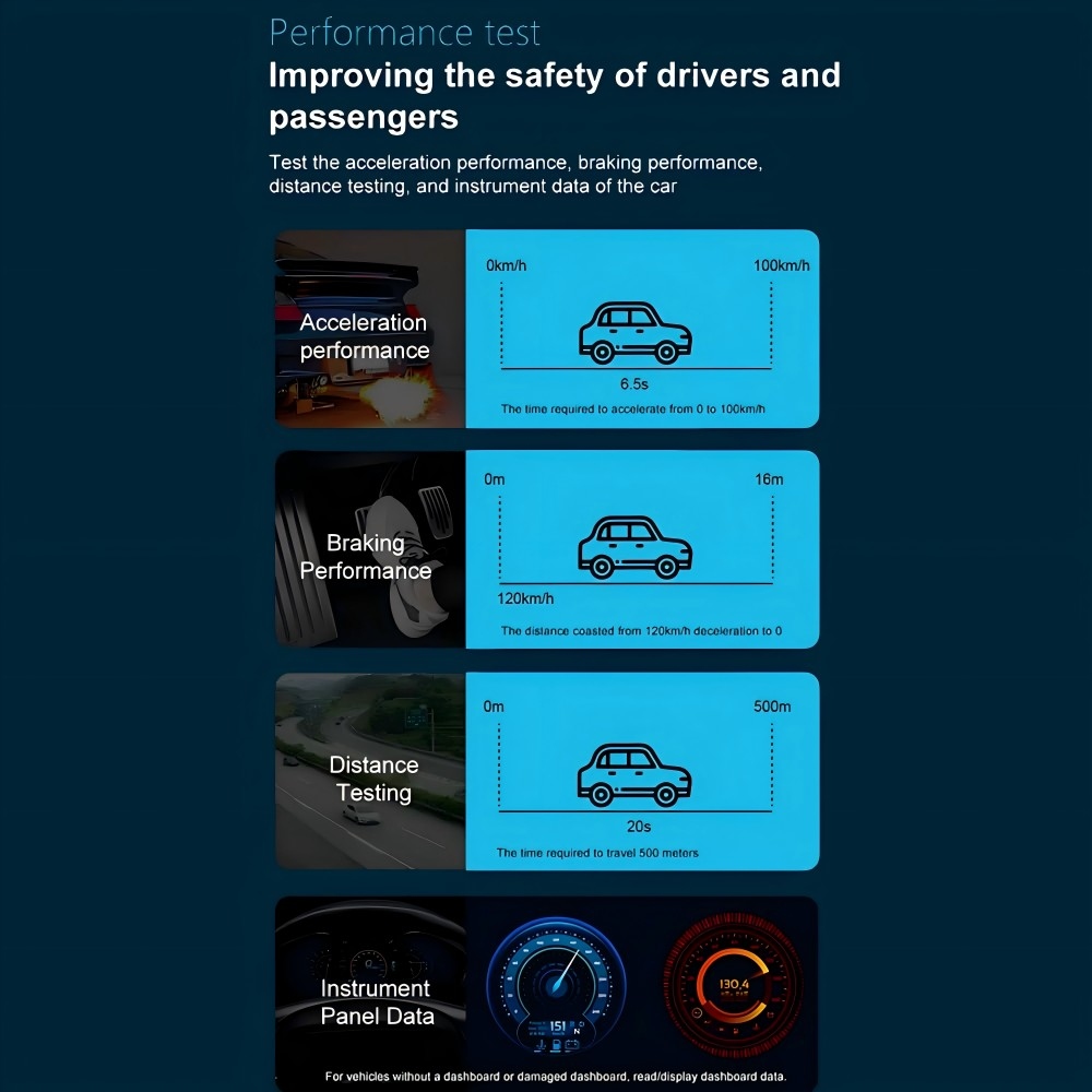 Наше рішення для тестування продуктивності розроблено для підвищення безпеки водія та пасажирів шляхом ретельної оцінки ключових аспектів продуктивності автомобіля. Оцінюючи прискорення, гальмування, відстань і дані приладів, ми надаємо вичерпну інформацію, необхідну для забезпечення оптимальної безпеки та надійності автомобіля.