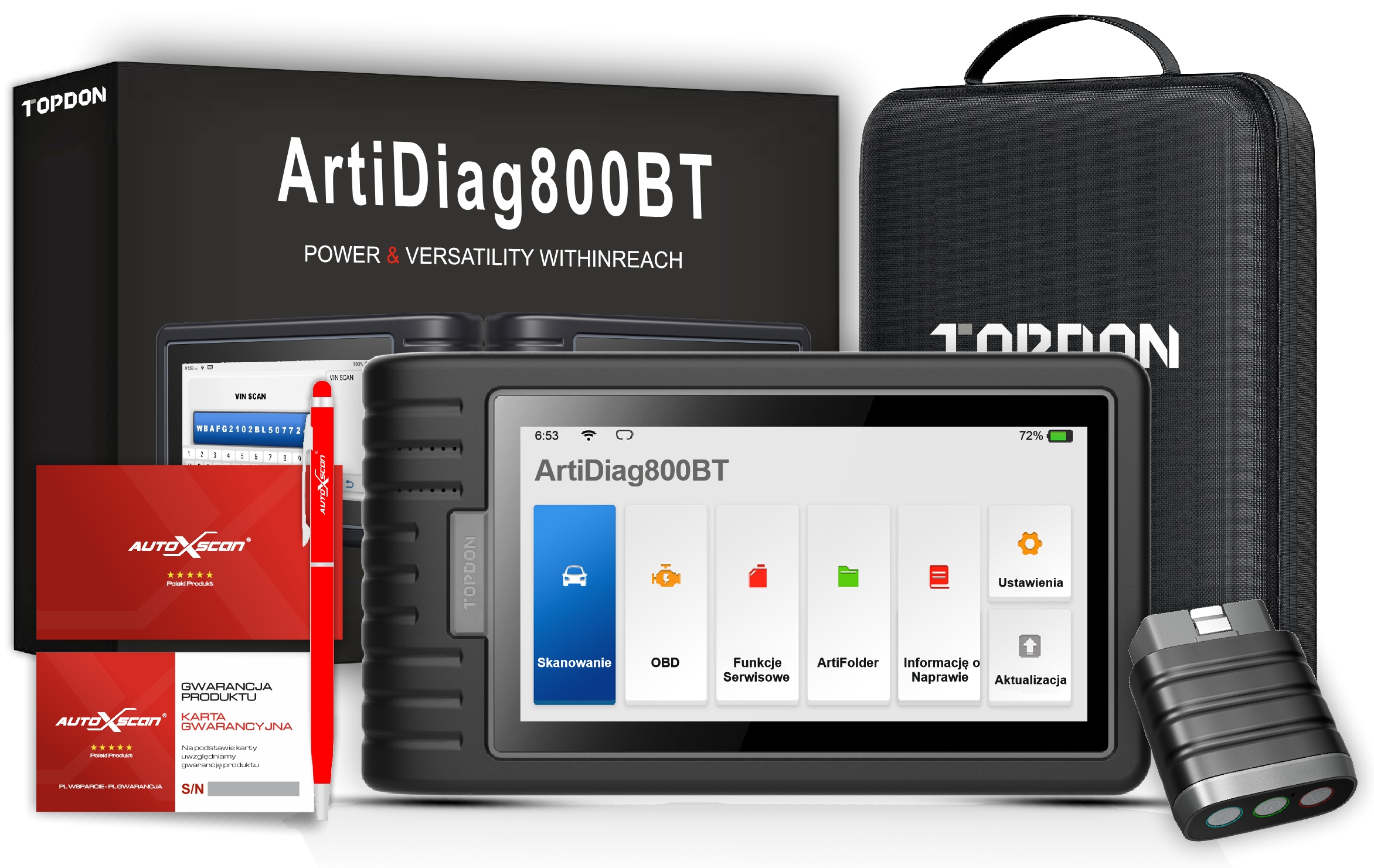 Тестер — це автономний прилад для майстерні, оснащений 6-дюймовим сенсорним екраном, броньованим кожухом у формі ковпака! Тестер має повний доступ до всіх модулів керування практично кожного авто, плюс 28 сервісних функцій. Модель ArtiDiag800BT працює на базі операційної системи Android. Diagnoskop повністю працює польською мовою