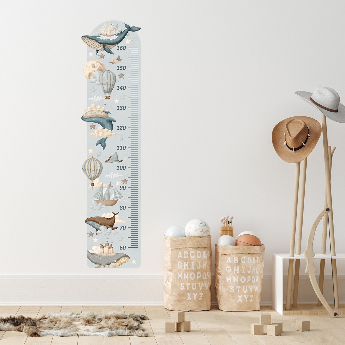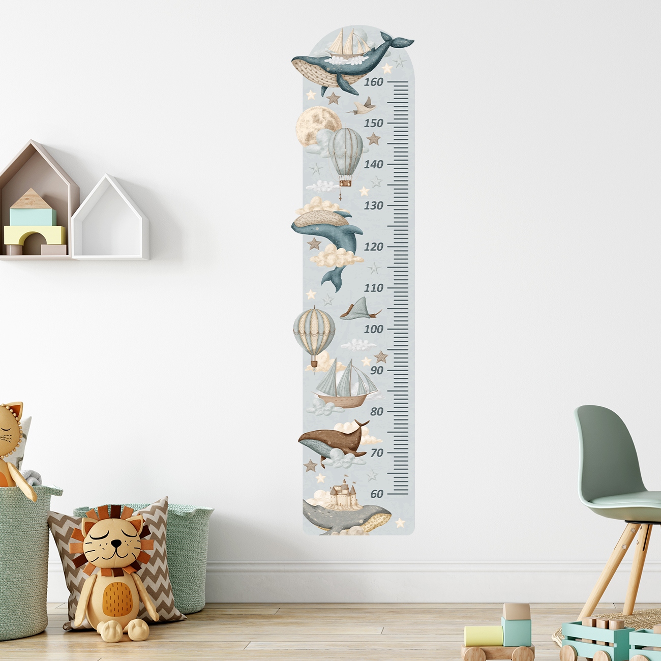 Наша таблиця росту з чарівними китами, кораблями та повітряними кульками, яку можна приклеїти до стіни, не лише гарно прикрасить кімнату вашої дитини, але й дозволить вам перевірити, як швидко росте ваша дитина.
