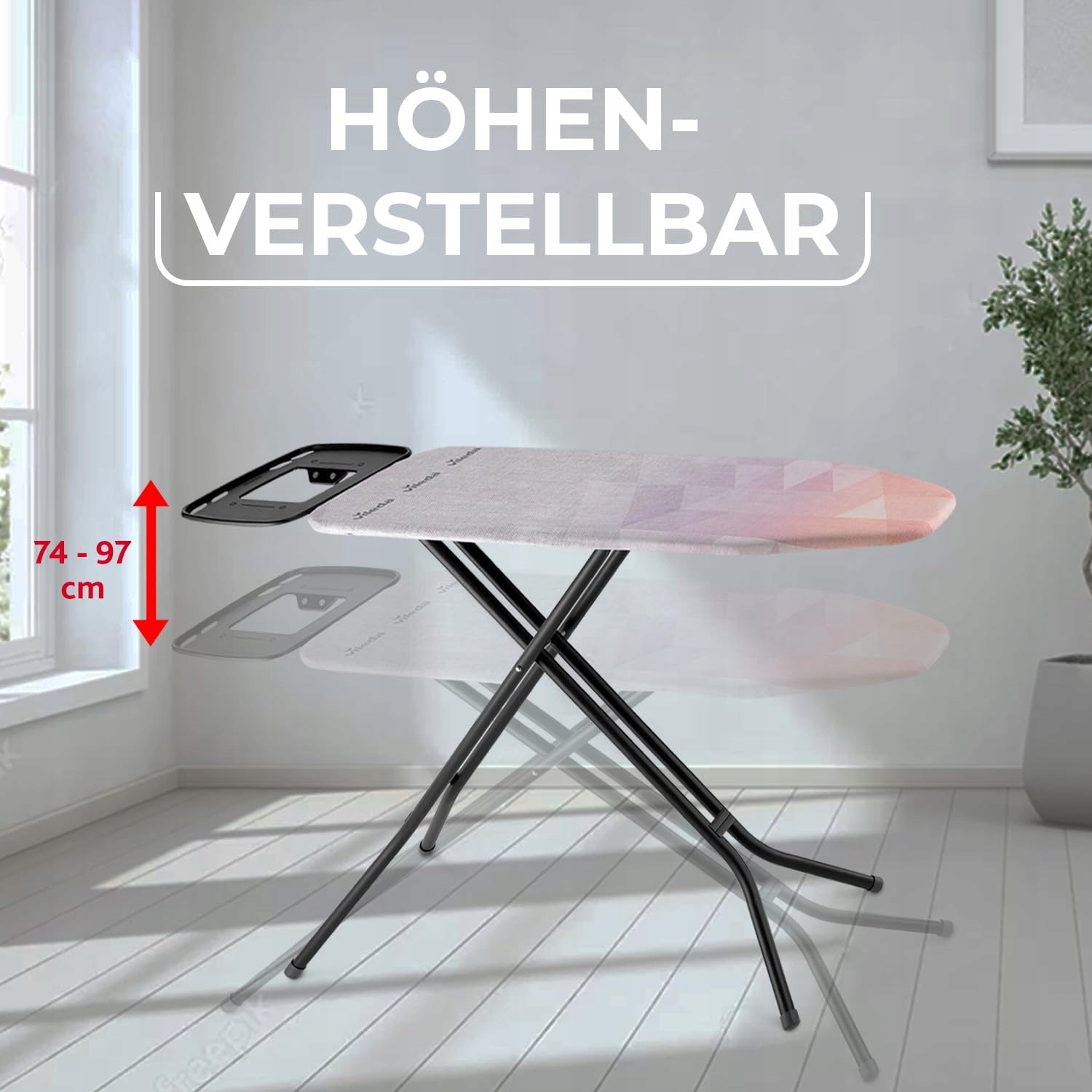 Зручна прасувальна дошка - Діамантова дошка Vileda Arriament оснащена прасувальною дошкою, покритою титаном, металевою полицею для пароплавних станцій та стабільною рамою.