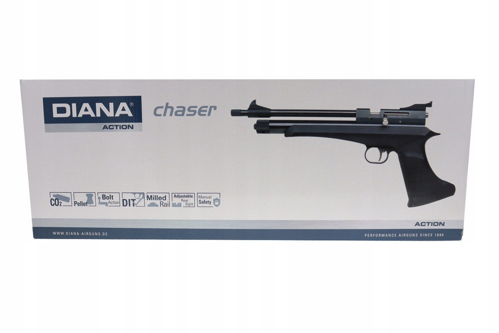 Елементи конструкції пістолета «Діана», такі як стовбур, цистерна з CO2 і курок, виготовлені з металу, що позитивно впливає на довговічність і якість виробу. Міцна і міцна конструкція рукоятки і ложа забезпечує довговічність і ергономічність у використанні.Пістолет Chaser оснащений 11-мм рейкою, завдяки якій можна встановити коліматорний або лазерний приціл. На кінці стовбура є стандартна різьба 1/2" UNF, що дозволяє встановити спеціальний глушник.