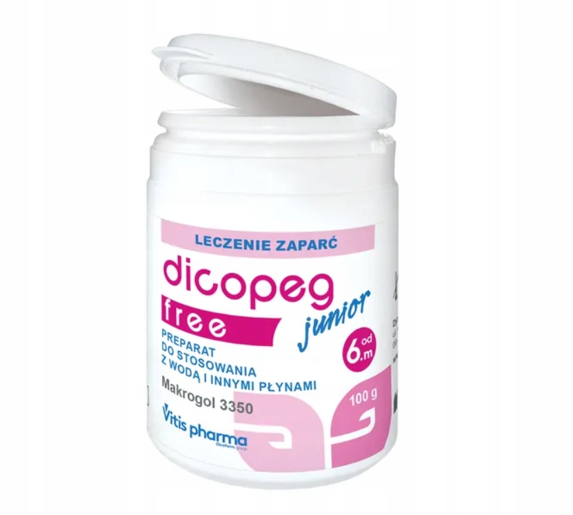 Dicopeg Junior Free характеризується осмотичним проносним ефектом, що природним чином регулює роботу кишечника. Препарат не всмоктується і не піддається ферментації в кишечнику. Не подразнює слизову оболонку кишечника і виводиться з калом у незміненому вигляді. Завдяки своїм гідрофільним властивостям Dicopeg Junior Free ефективно розм'якшує кал, значно полегшуючи дефекацію. Важливо те, що це не викликає спазмів, болю в животі або раптових позив. Його ефективність не зменшується з часом.