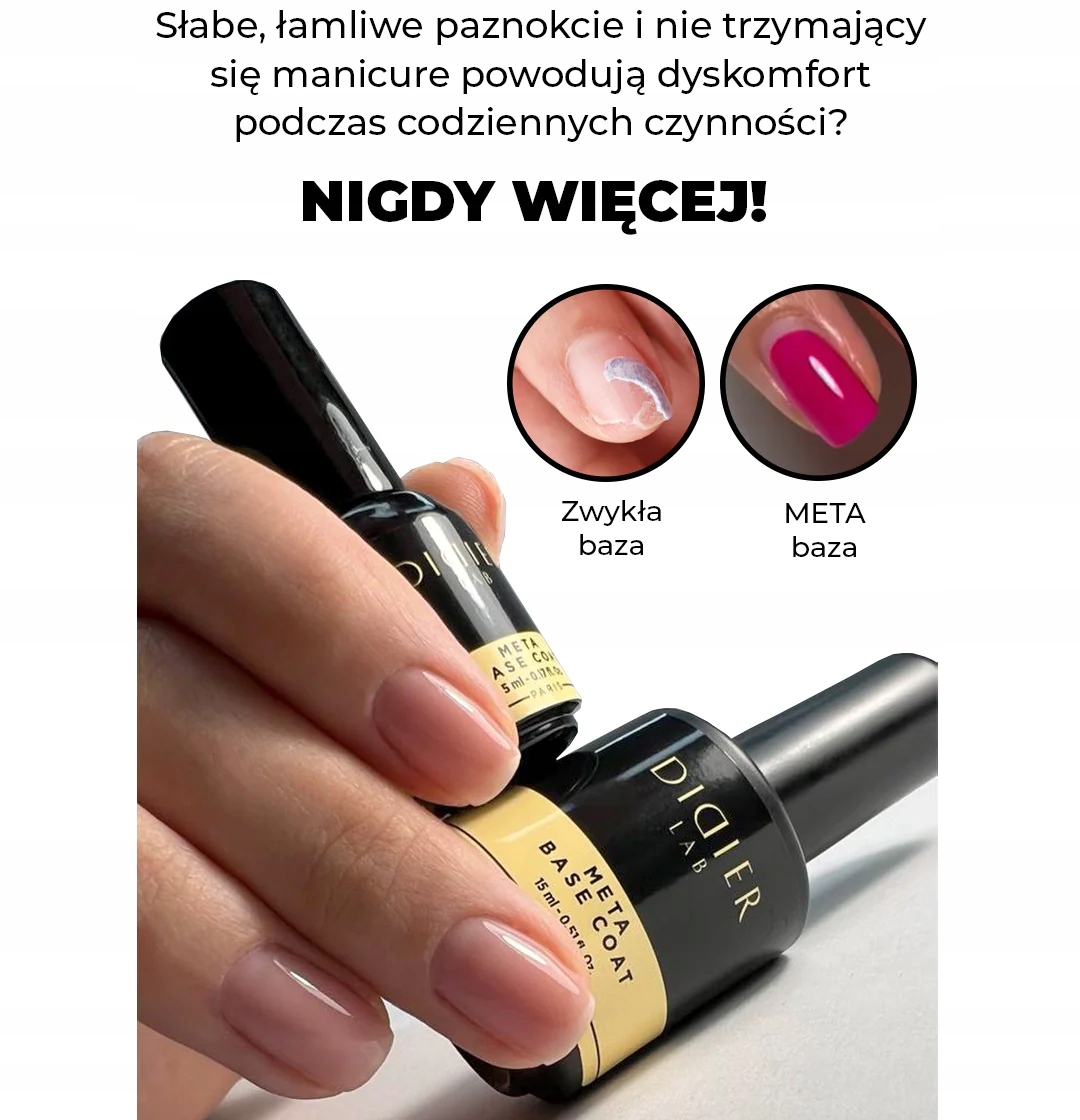 мета -основа лабораторій DiDier - особливо концентрована суміш інгредієнтів, що зміцнюють і підвищують манікюрну стійкість. Мономери з підвищеною функціональністю мають надзвичайно велику кількість "реактивних місць", що призводить до надзвичайно стабільного зв’язку зі загартованим матеріалом. Універсальна мета -основа може використовуватися як для гібридного, так і для гелевого манікюру.