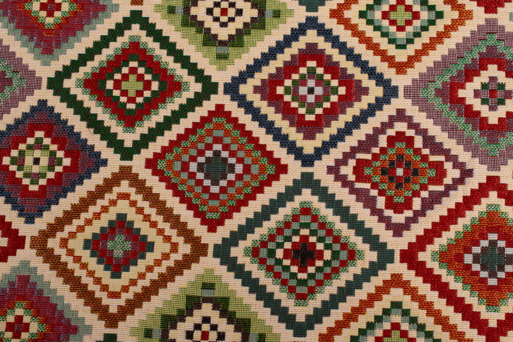 Оббивна тканина, показана на знімках, має геометричний візерунок, що складається з діамантових форм у різних кольорах. Домінуючі кольори - червоні, зелені, сині, коричневі, бежеві та вершки. Кожна форма алмазу наповнена меншими геометричними візерунками, які створюють ілюзію глибини та тривимірність. Шаблони повторюються та симетричні, що надає тканині традиційний і сільський вигляд, що нагадує народні чи етнічні мотиви. Тканина має досить щільну структуру, що робить її міцною і міцною, ідеальною для оббивних меблів або обрізних подушок. Тканина Diego доступна в одній різнокольоровій кольоровій версії. Розмір елементів становить близько 10 см