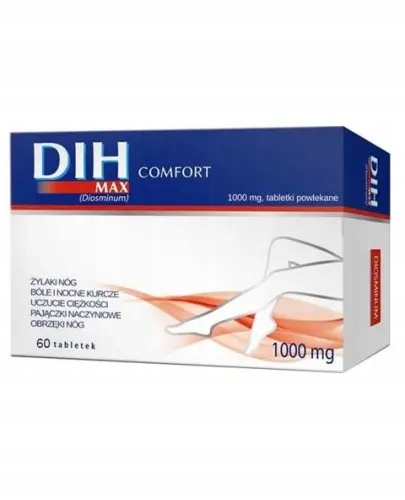 ДИХ Макс Комфорт — лікарський засіб у формі таблеток, вкритих оболонкою. Препарат містить діосмін. DIH Max Comfort підвищує напругу венозних судин і має захисну дію на судини. Препарат призначений для дорослих.