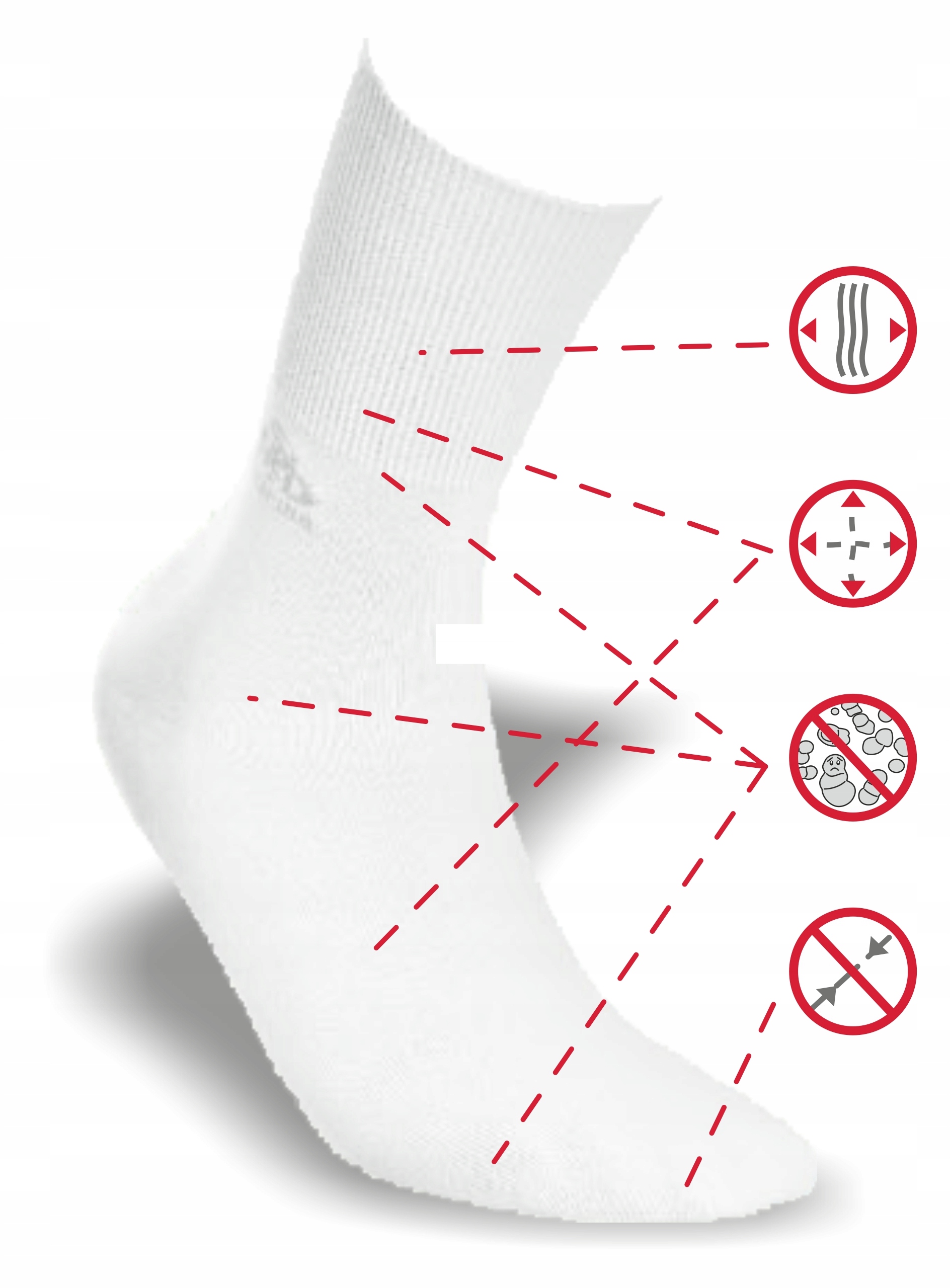 Виняткова делікатність бамбукової пряжі на дотик у поєднанні з безшовним з’єднанням над пальцями гарантує комфорт людям із дуже чутливими ногами, наприклад, діабетичними. Природні довготривалі антибактеріальні властивості бамбукової пряжі посилюються антибактеріальним і протигрибковим покриттям Sanitized®, вбудованим у волокна, що забезпечує майже повне знищення мікробів і сильний ефект проти запаху.
