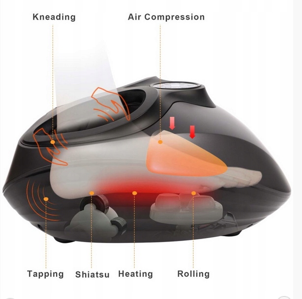 - Функції масажу з одночасним розминанням і тризонним тиском: п'ята-арка-стопа