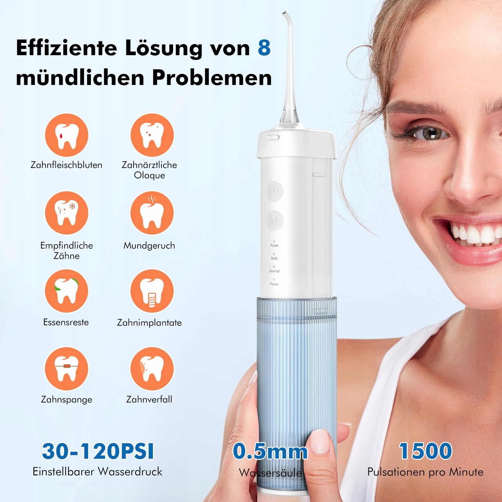 - 【Професійне глибоке очищення, вдосконалення здоров’я зубів】 Цей іригатор пропонує подвійний імпульс води під високим тиском від 1400 до 1600 разів на хвилину та сильний тиск води від 45 до 130 дюйм до глибокого очищення зубів. Ефективно вирішує різноманітні пероральні проблеми, такі як тартар, ясна кровотеча, неприємний запах з рота, ортодонтичні прилади та карієс.