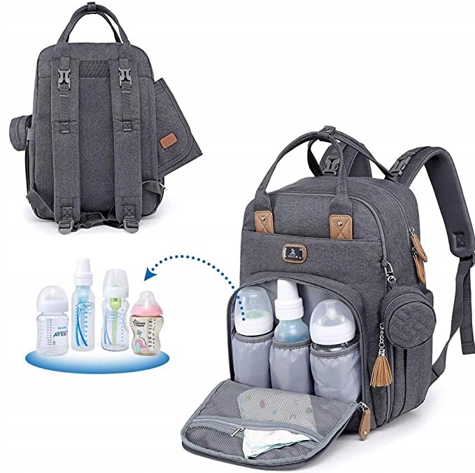 1 x основне відділення містить 6 внутрішніх кишень для ноутбука, пляшок, одягу, закусок, іграшок, рушники та все необхідне. 2 органайзери для підгузників і сітчаста кишеня для необхідних речей дитини. 1 x передня кишеня для матері для зберігання речей батьків. 3 ізольовані кишені для молочних пляшок і сітчаста кишеня для інших речей. 1 передня кишеня з петлею для ключів може краще зберігати ваші ключі, 2 бічні кишені для серветок і пляшки з водою або парасольки. 1 x протиугінна кишеня для захисту вашого гаманця та телефону.
