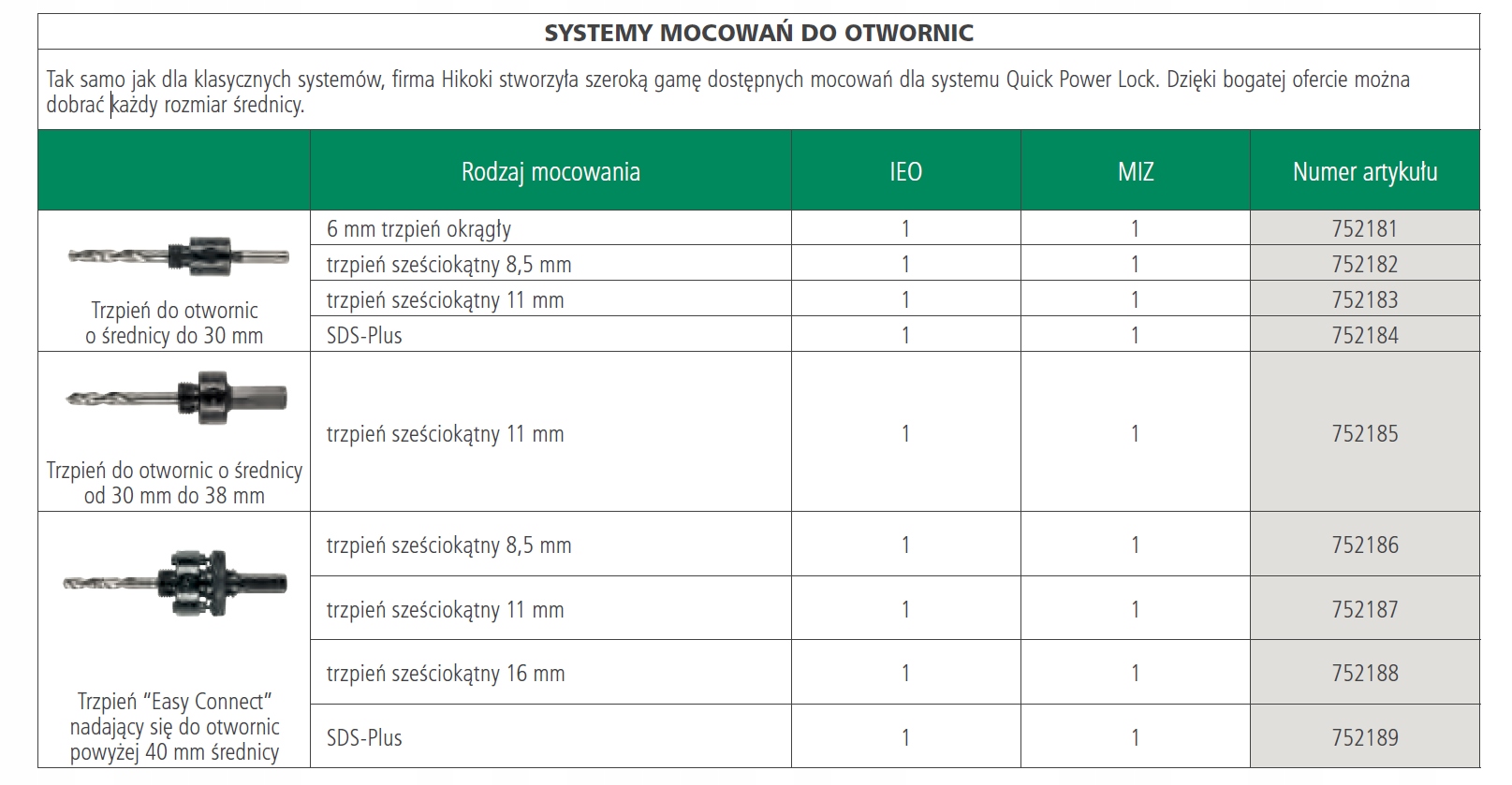 Нижче доступні кріпильні хвостовики для біметалевих діркових пилок HIKOKI та список аксесуарів