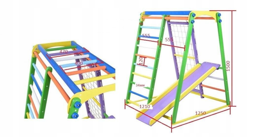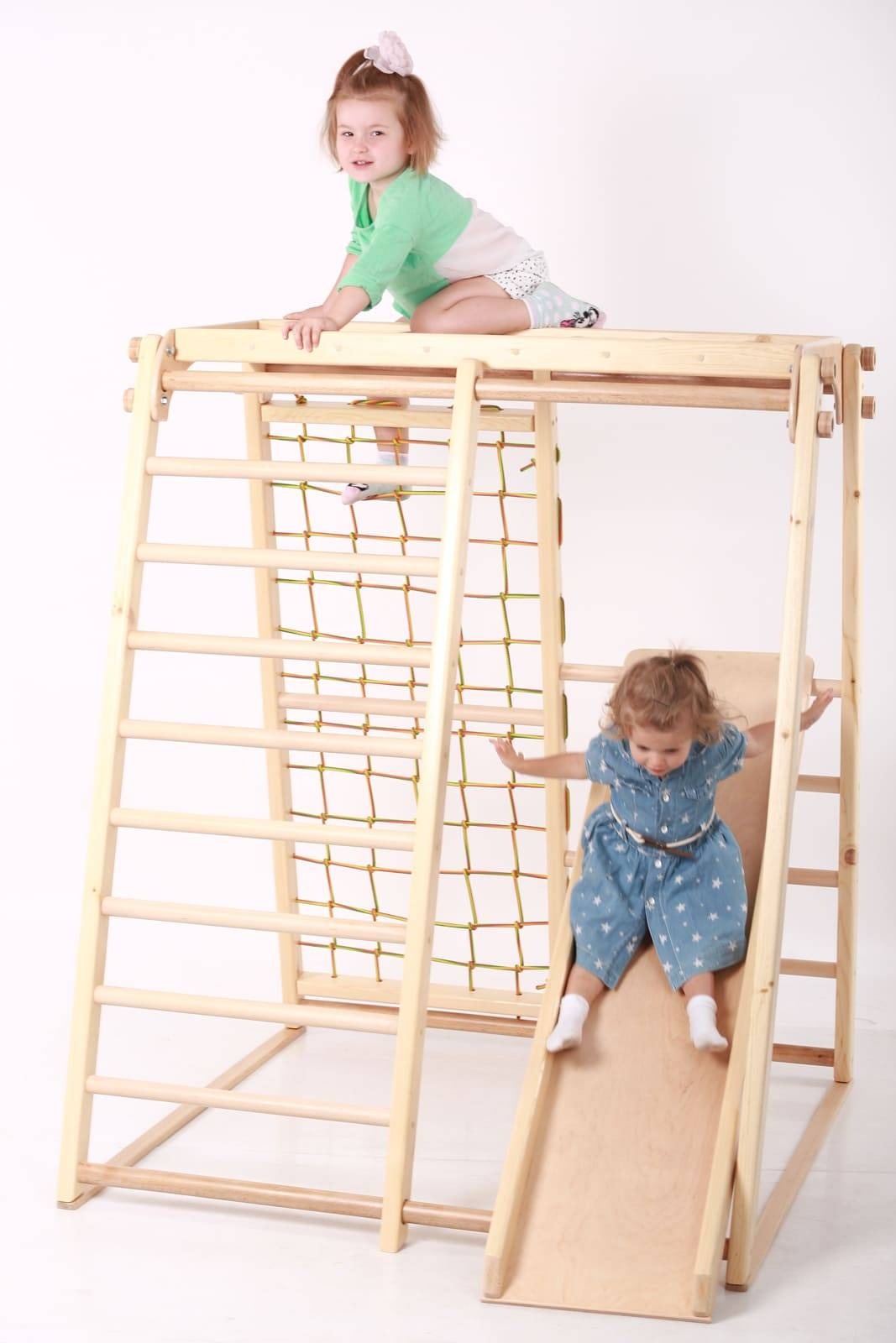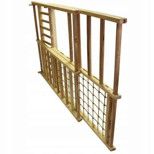 У набір входять: дерев'яна драбина, сітка для лазання, дерев'яна гірка, горизонтальна драбина