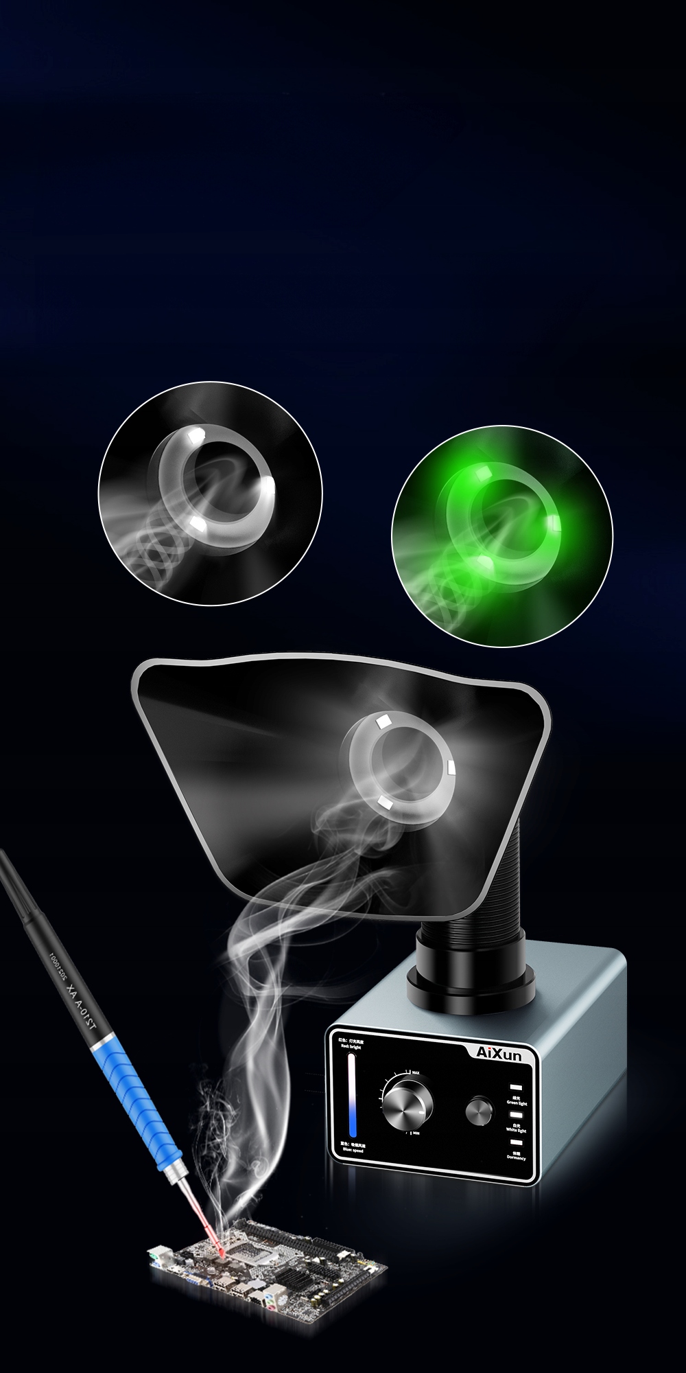 AIXUN Absorber Absorber - це вдосконалений пристрій, створений для точного ремонту пайки, що забезпечує чисте та безпечне робоче середовище. Завдяки сучасним технологіям, твердій конструкції та інтуїтивно зрозумілої роботи, забобони Aixun відповідатимуть очікуванням навіть найвибагливіших користувачів. Система фільтрації з активним вуглецем та HEPA ефективно видаляє випари, пил та неприємні запахи, забезпечуючи комфорт під час роботи. Інтелектуальні функції, такі як голосовий контроль та автоматичний запуск, підвищують ефективність та зручність використання. Суцільний алюмінієвий корпус гарантує довговічність та естетичний вигляд.