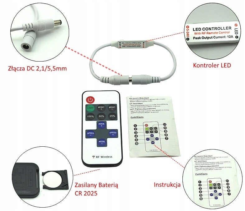 ДІММЕР ДЛЯ СВІТЛОДІОДНОЇ СТРІГИ З РАДІОПУЛЬТОМ 12V 24V