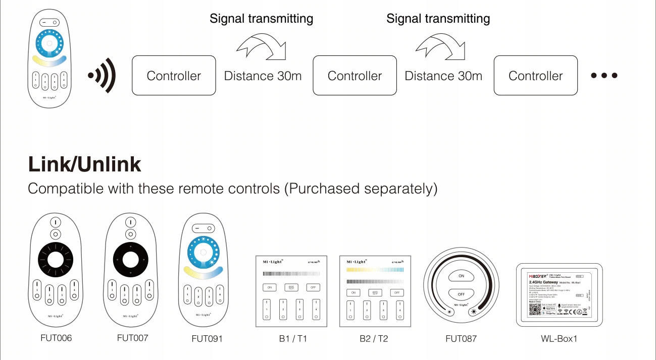 У поєднанні з дистанційним керуванням ви можете керувати освітленням від 1 до 4 незалежних світлодіодних зон (кожна зона - один приймач). До однієї зони на пульті можна підключити багато ланцюгів освітлення. Потрібне підключення до світлодіодного джерела живлення.