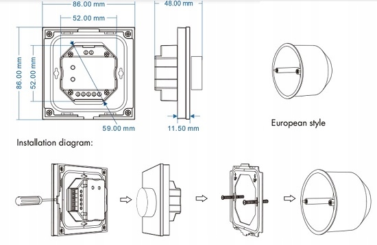 Сучасний диммер у вигляді світлодіодної панелі, встановленої в настінну інсталяційну коробку, призначений для роботи з регульованими джерелами живлення 0/1-10 В. Цей контролер диммування призначений для регулювання яскравості монохроматичне освітлення, напр. Світлодіодна панель T18-2B працює в одній зоні освітлення, крім регулювання яскравості дозволяє вмикати/вимикати світло. Він працює як дротовий або бездротовий контролер завдяки радіозв'язку 2,4 ГГц. Встановлюється на стандартну монтажну коробку. Лицьова частина панелі виконана з чорного скла