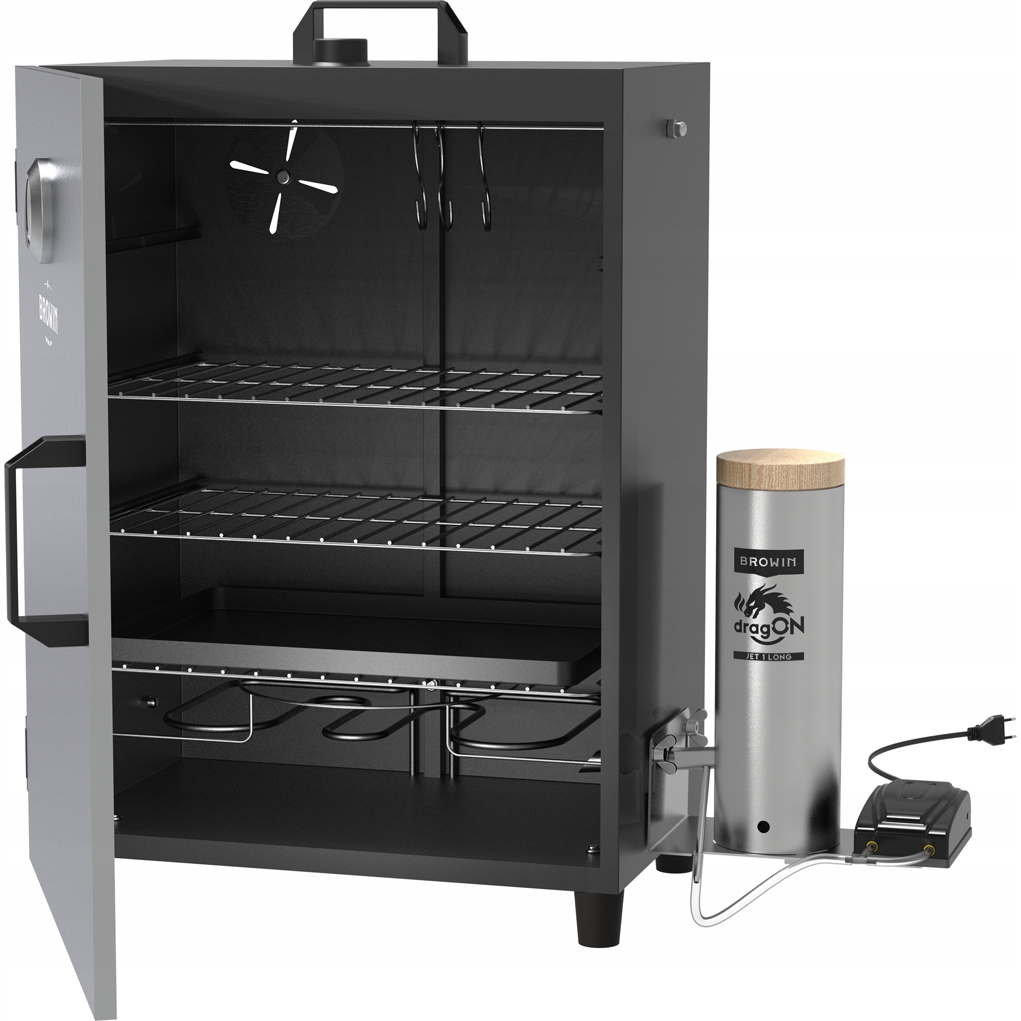 - Інноваційний димогенератор насадка - її конструкція з відповідно обрізаними кінцями, спеціальна кутова труба та підключений насос забезпечують ідеальне, рівномірне видування диму в коптильню та високу ефективність з низьким споживанням деревної тріски. Насадка вводиться в коптильню під кутом, який збільшує потік диму та допомагає мінімізувати накопичення осаду, який забиває типові труби під час відпалу деревної стружки. Повітряний насос під’єднується через шланг до кутової трубки, інтегрованої з насадкою.