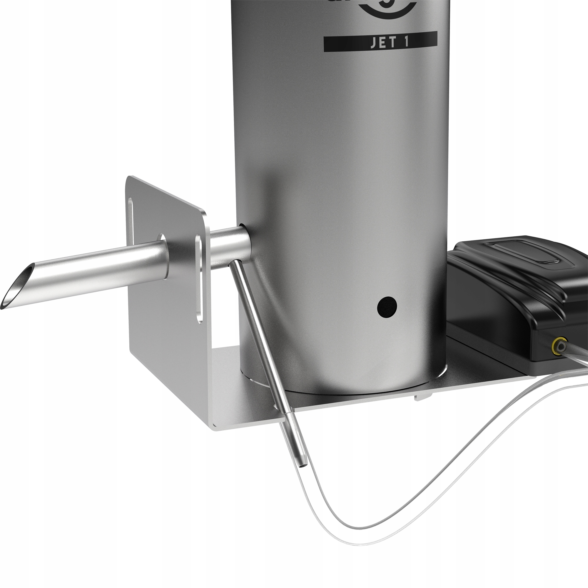 - Інноваційна насадка димогенератора - її конструкція з відповідно обрізаними кінцями, особливим кутом трубка та підключений насос забезпечують ідеальне, рівномірне видування диму в коптильню та високу ефективність із низьким споживанням стружки. Насадка вводиться в коптильню під кутом, який збільшує потік диму та допомагає мінімізувати накопичення осаду, який забиває типові труби під час відпалу деревної стружки. Повітряний насос під’єднується через шланг до кутової трубки, інтегрованої з соплом.