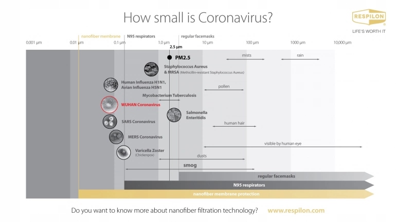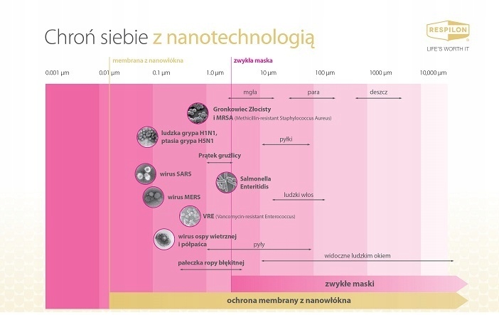 ReSpimask® має знак CE та інші схвалення. РеСпімаск® забезпечує надійний захист від вірусу Ебола та туберкульозу. RESPILON® береже здоров'я. Вироби з мембраною з нановолокна забезпечують здорове дихання та безпроблемне дихання. Ефективність фільтрації перевірена Nelson Laboratories. Незважаючи на високу щільність нановолокон, Respilon® дуже проникний для повітря та пари, що підвищує комфорт виробу та дозволяє користувачеві легко дихати.