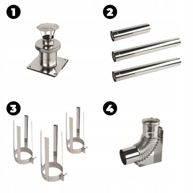 Високоякісна сталь, (2) НЕРЖАВІЮЧА КИСЛОТОСТІЙКА ТРУБА для відведення вихлопних газів із діаметром Ø 80 мм і довжиною 1000 мм і 500 мм в залежності від висоти димохід товщиною 0,6 мм, марка 1.4404. У всіх з'єднаннях використовуються силіконові прокладки для підтримки належного надлишкового тиску та запобігання можливому витоку конденсату. Дуже важливо, щоб система димоходу була зібрана таким чином, щоб конденсат стікав вільно і не накопичувався, напр. в ущільненнях.