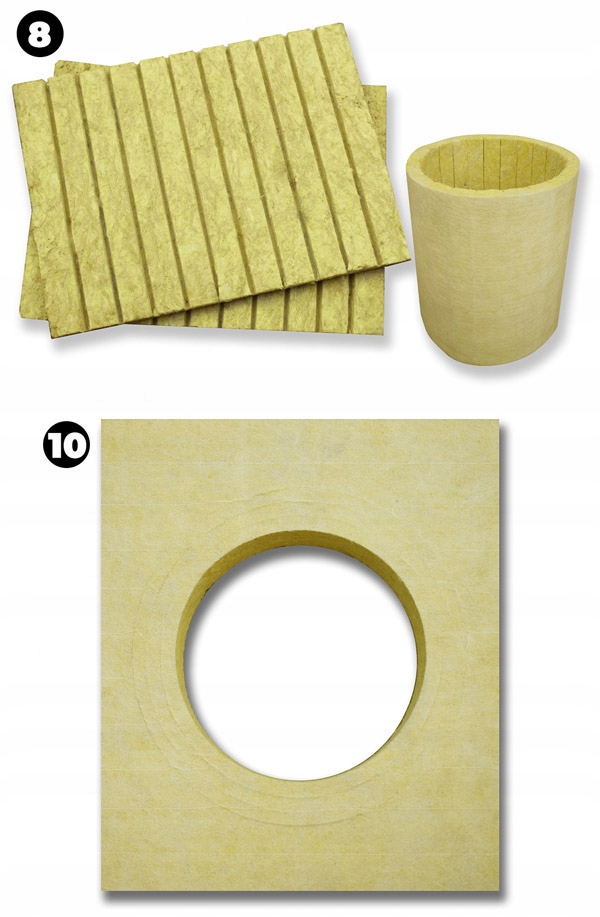 (10) ПЕРЕДНЯ ПАНЕЛЬ - виготовлена з негорючої гідрофобізованої мінеральної вати. Його завдання - усунути напруги, які можуть виникнути в процесі експлуатації димоходу. Він також герметизує отвір у блоках димоходу, де котел під’єднується до димоходу.