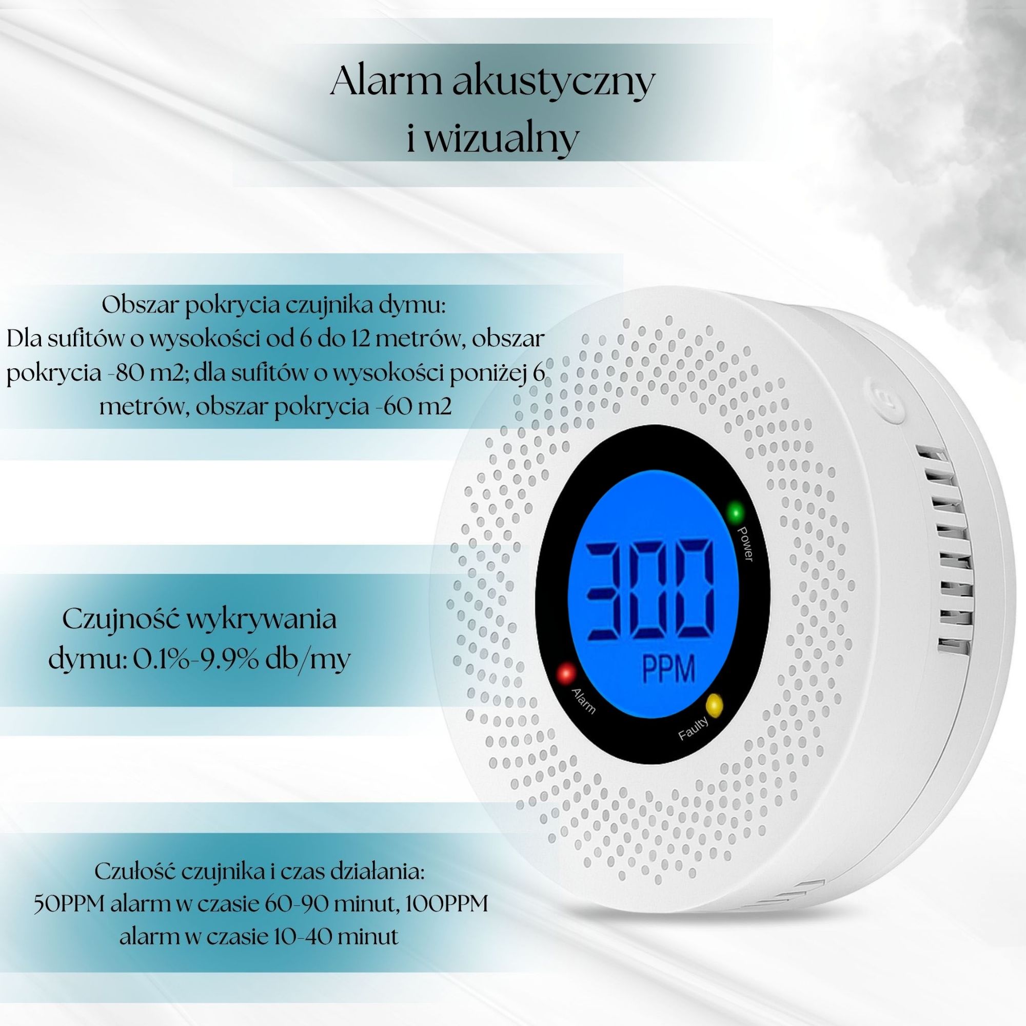 • Часу датчика та час дії: 50ppm тривоги в 60-90 хвилин, 100ppm сигналізація в 10-40 хвилинах. -9,9% дБ/м