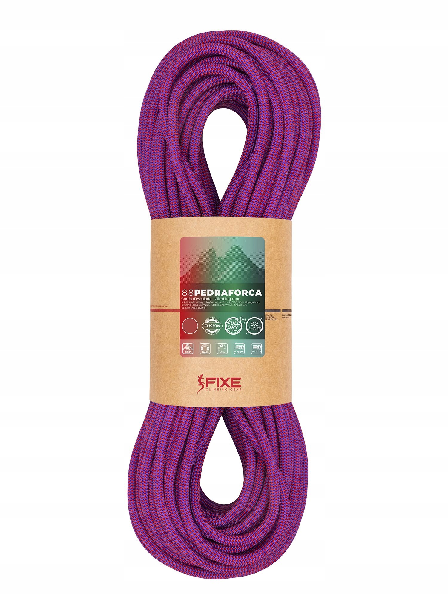 Динамічне скелелазіння PEDRAFORCA 80 M0 M - Фіолетова була повністю просочена. Повна суха - це просочення ядра та коси, що запобігає проникненню води у її внутрішню частину, що суттєво впливає на довше життя моделі. Висока сила ідеально підходить у гірській зоні. Його маленький діаметр і використання як єдина мотузка вимагає великого досвіду в розпалах. Весь чудово працює з запаленими інструментами, що дозволяє вам плавно проводити мотузку.