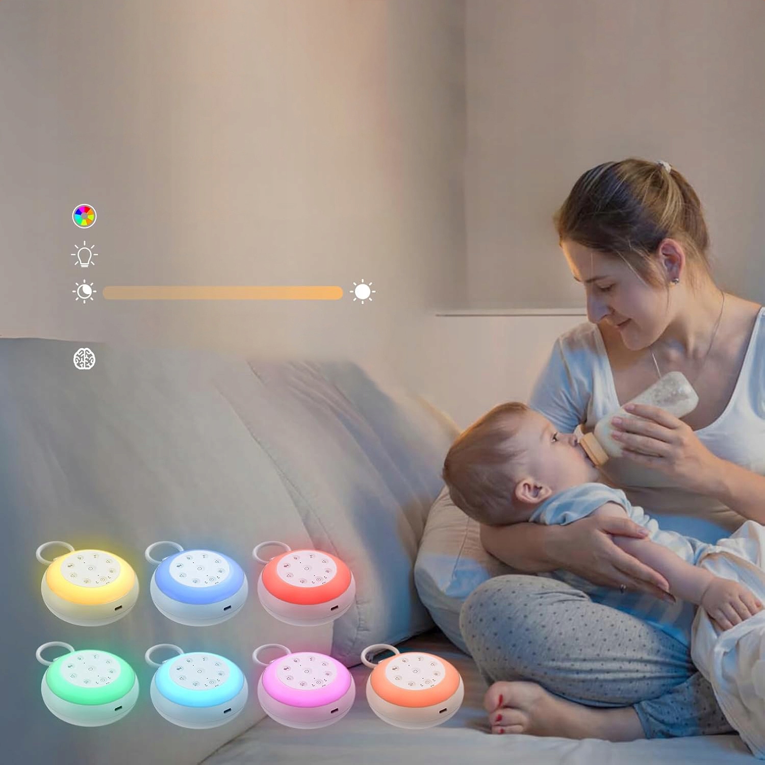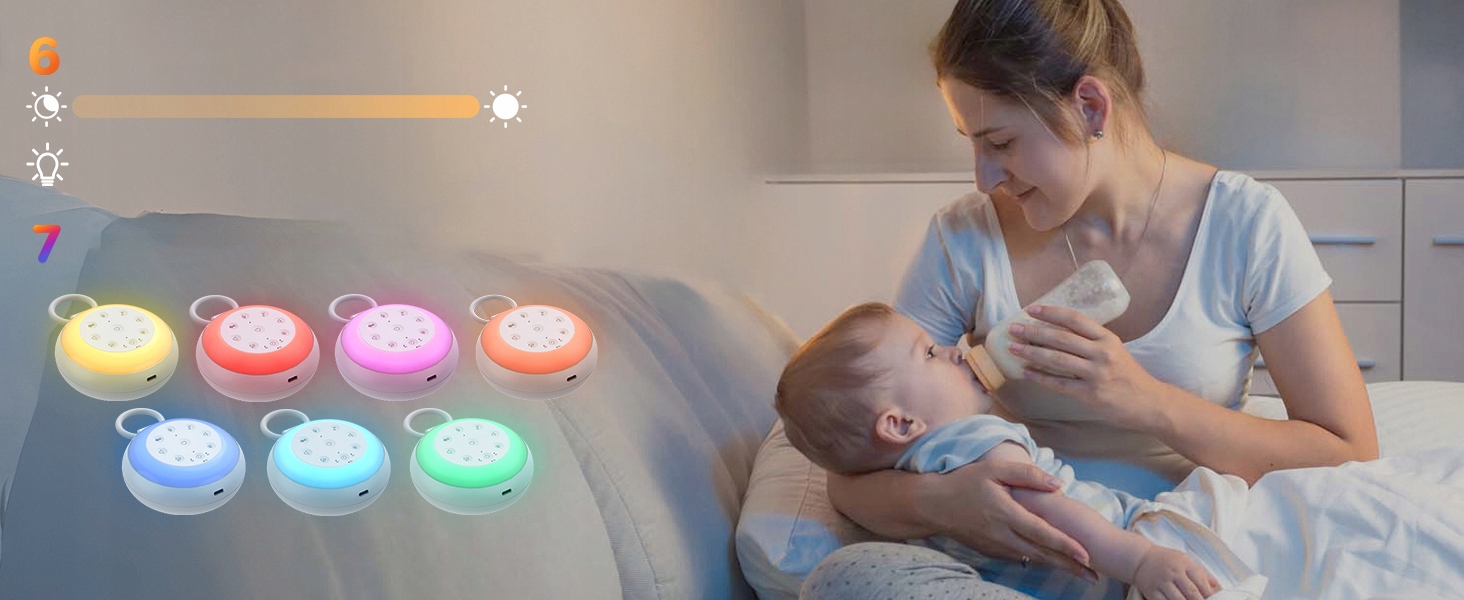 ✨ Дитяча машинка з білим шумом і нічником має 7 варіантів кольорів, а також функцію дихального світла та 6 регульованих рівнів яскравості.