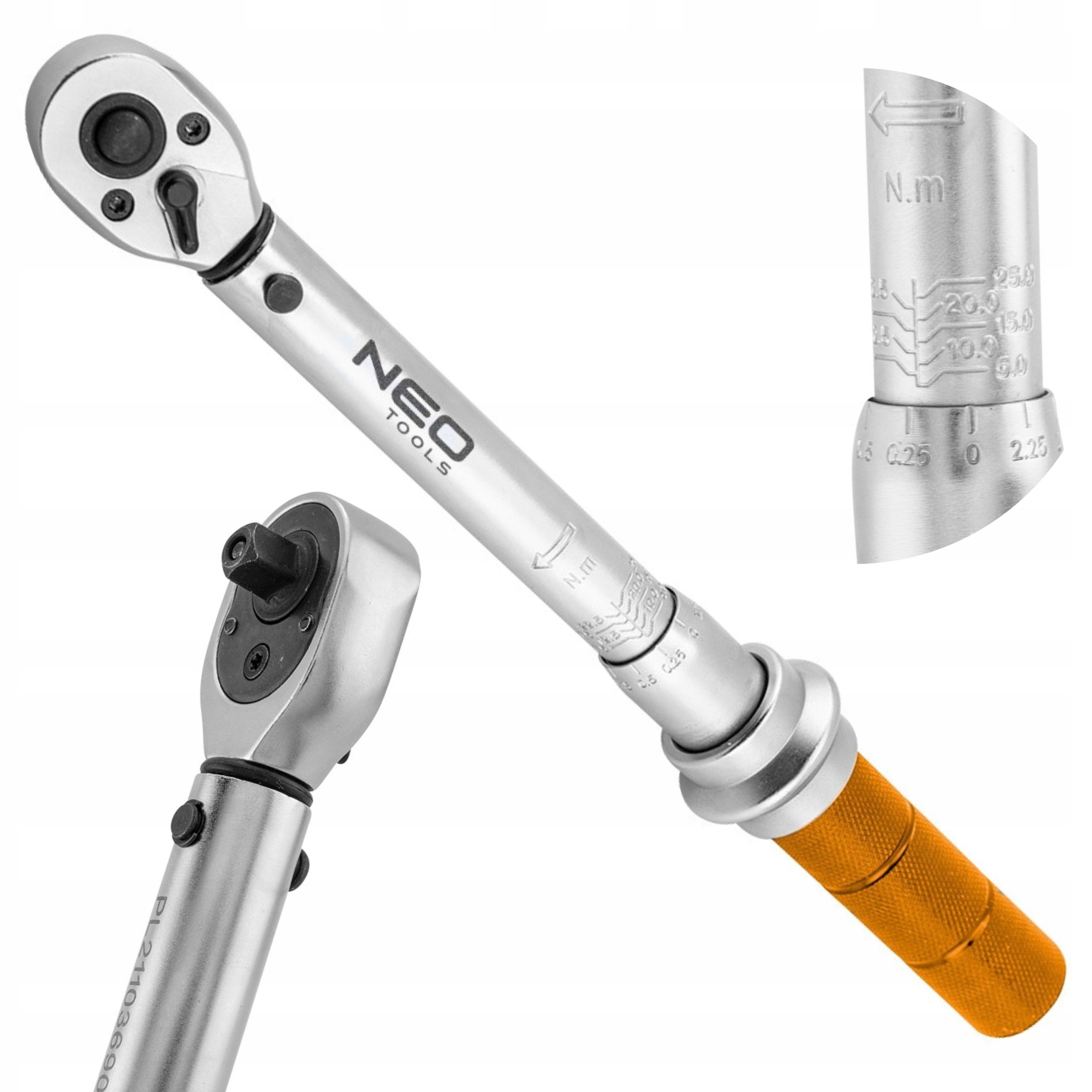 Динамометричний ключ ¼", 5-25 Нм, 08-822 від NEO має розмір наконечника ¼" і діапазон від 5 до 25 Нм. Загальна довжина інструменту 25 см. Ключ характеризується металевою конструкцією та посиленням із трубки з легованої сталі. Він має точність +/-4% від 20% до 100% максимального крутного моменту. Оснащений механізмом блокування Push-Pull забезпечує більшу свободу роботи. Робоча частина ключа виготовлена з міцної сталі CrV. Інструмент не можна зберігати з пружиною, встановленою на максимальні значення. Якість підтверджено сертифікатом калібрування та сертифікатом TÜV M+T. У набір входить практичний пластиковий футляр.