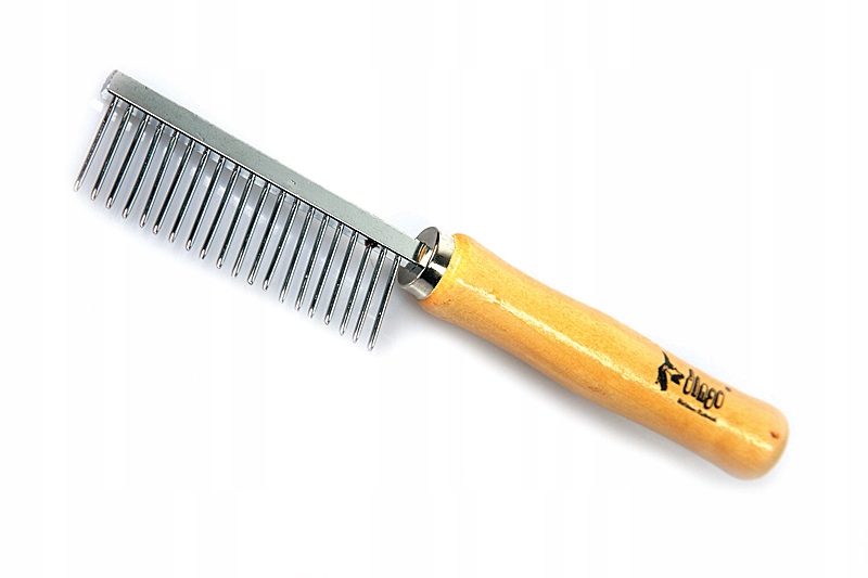 Представлений металевий гребінець з дерев’яною ручкою - це продукт з лінії догляду за домашніми тваринами. Він використовується для розчісування ядра у собаці. 4