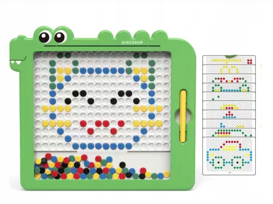 Якщо перетягнути стилус по дошці, маленькі магнітні кульки плаватимуть, створюючи зображення. У набір входять картки зі зразками малюнків. Гра з дошкою є вправою для дрібної моторики і допомагає підготувати дитину до самообслуговування, письма, малювання та навчання правильному хвату кліщів. DinoBoard також може бути формою спокою та відпочинку для дітей. Дошка відмінно підійде вдома і в дорозі.