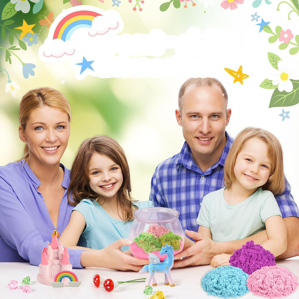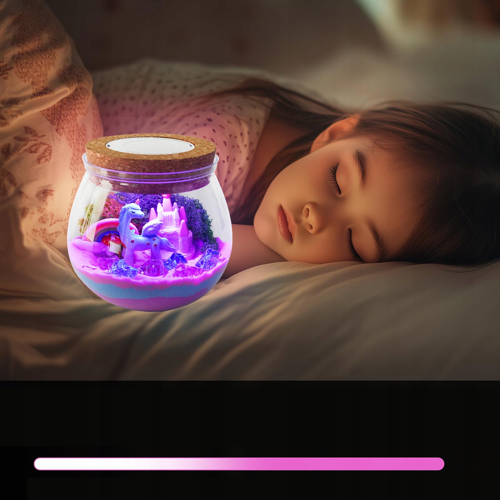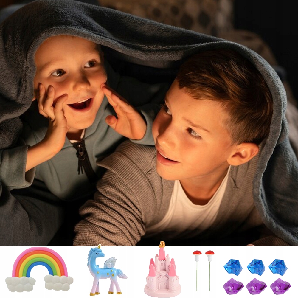 Цей набір для малювання єдинорога для дітей включає чарівний пісок, консервовані мохи, 13-кольоровий світлодіодний нічник з дистанційним керуванням, мініатюри єдинорога, мініатюри грибів, мініатюри замків та декоративні аксесуари. Милий проект декоративно-прикладного мистецтва для дітей.