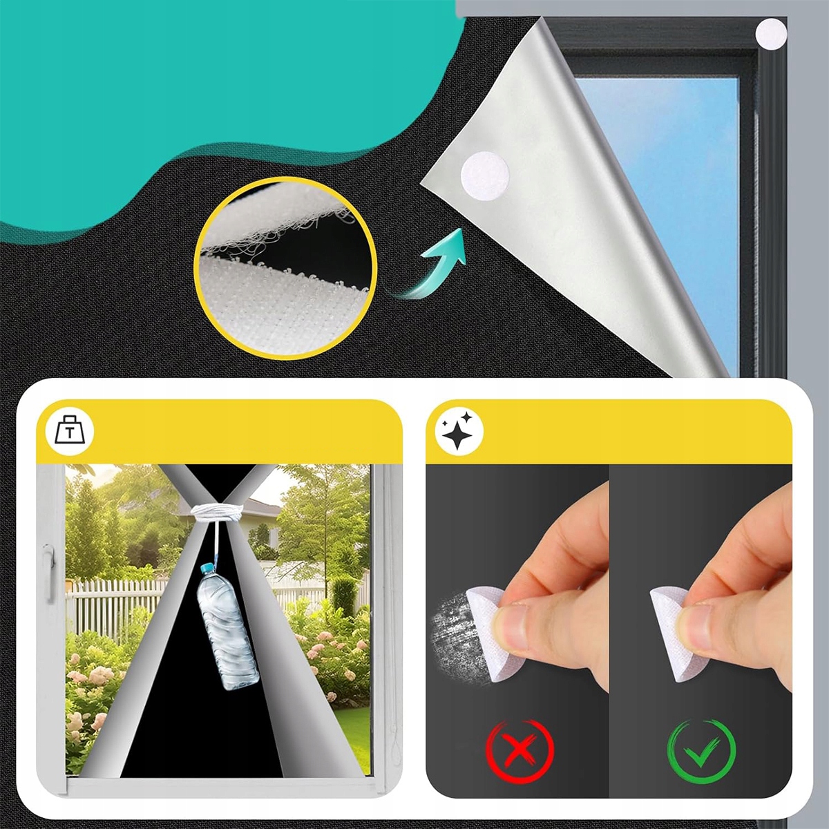 Портативні яскраві жалюзі оснащені 18 сильними невеликими присосними чашками та 18 шматочками сильної самозадійної фольги. Невеликі присоски забезпечують сильну адгезію і запобігають входу світла по краях віконної рами. І присосні чашки, і фольга підходять для багаторазового використання. Вони гарантують, що жалюзі затемнення сильно прикріплені і не впадуть легко. Жодних додаткових аксесуарів не потрібні, що спрощує процес встановлення, що дозволяє вам насолоджуватися зручністю та тривалою продуктивністю темних жалюзі без буріння.
