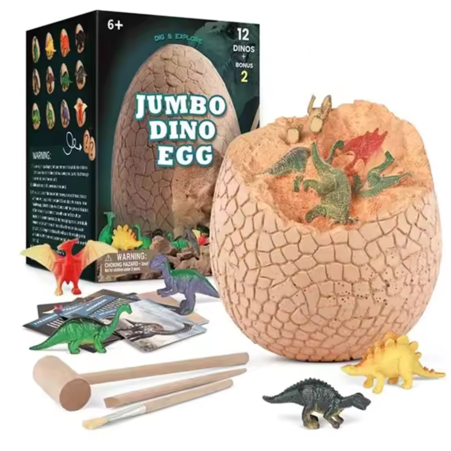 Інструменти для виявлення: набір містить інструменти, необхідні для акуратного викопування та вилучення дитинчат динозаврів із гіпсового яйця. Діти можуть використовувати молоток і зубило для точної археологічної роботи.