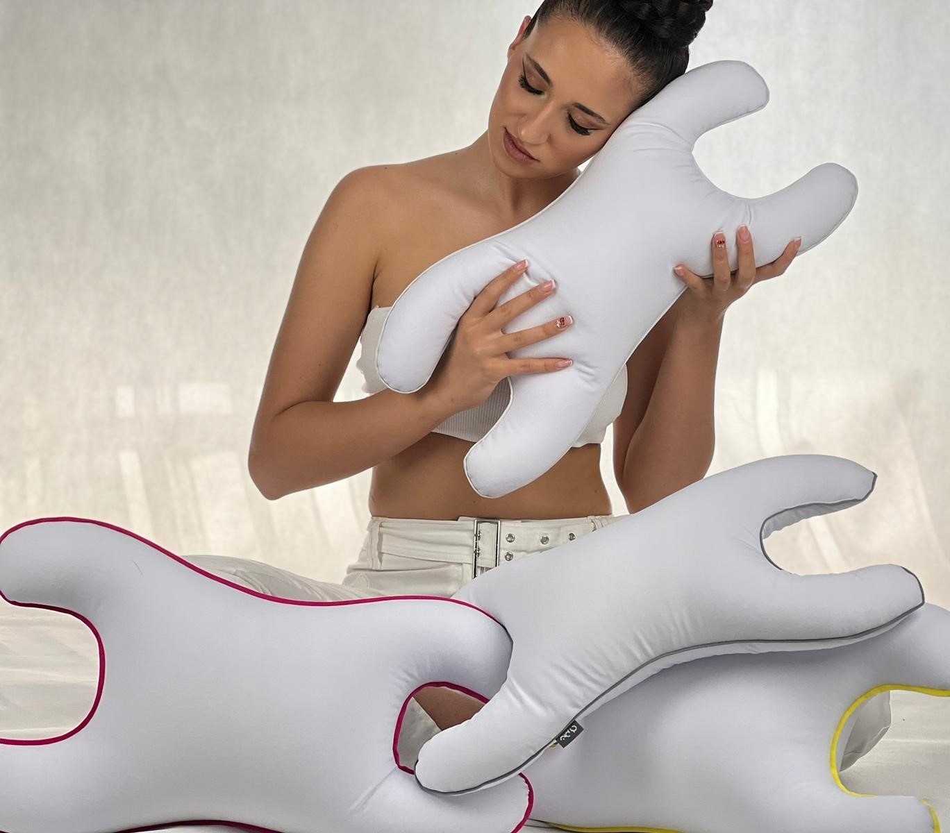 Подушка виготовлена ​​з білого матеріалу, обробленого сірим обрізанням. Різні кольори обрізки, показані на знімках із моделлю, призначені лише для диверсифікації фотографій.