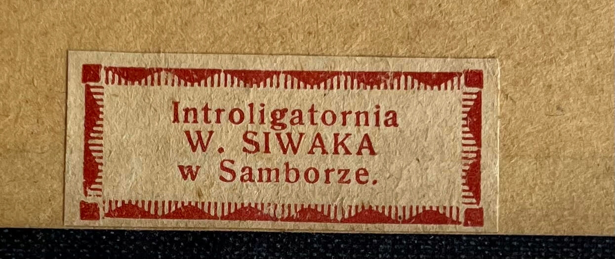 Опис: Прекрасний документ від Kresy. Лустрований диплом, склеєний на полотні, складений. Печатка комісії з іспитів та асоціації окупності в Самборі. Цікава, рідкісна наклейка для книг W. Siwak від Sambor