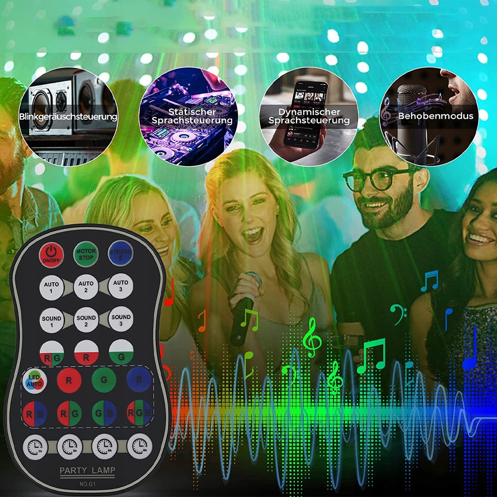 Партійне світло може перемикати дев'ять режимів роботи (3 автоматичні режими + 3 режими звуку + 3 режими спалаху), ви можете вільно змінити режим освітлення та ефект світла за допомогою пульта дистанційного керування та насолоджуватися атмосферою релаксації. Завдяки потужному датчику звуку, вогні можуть змінюватися відповідно до ритму музики чи твоїй плескання. Яскраві та сильні лампочки принесуть енергію кожній вечірці!