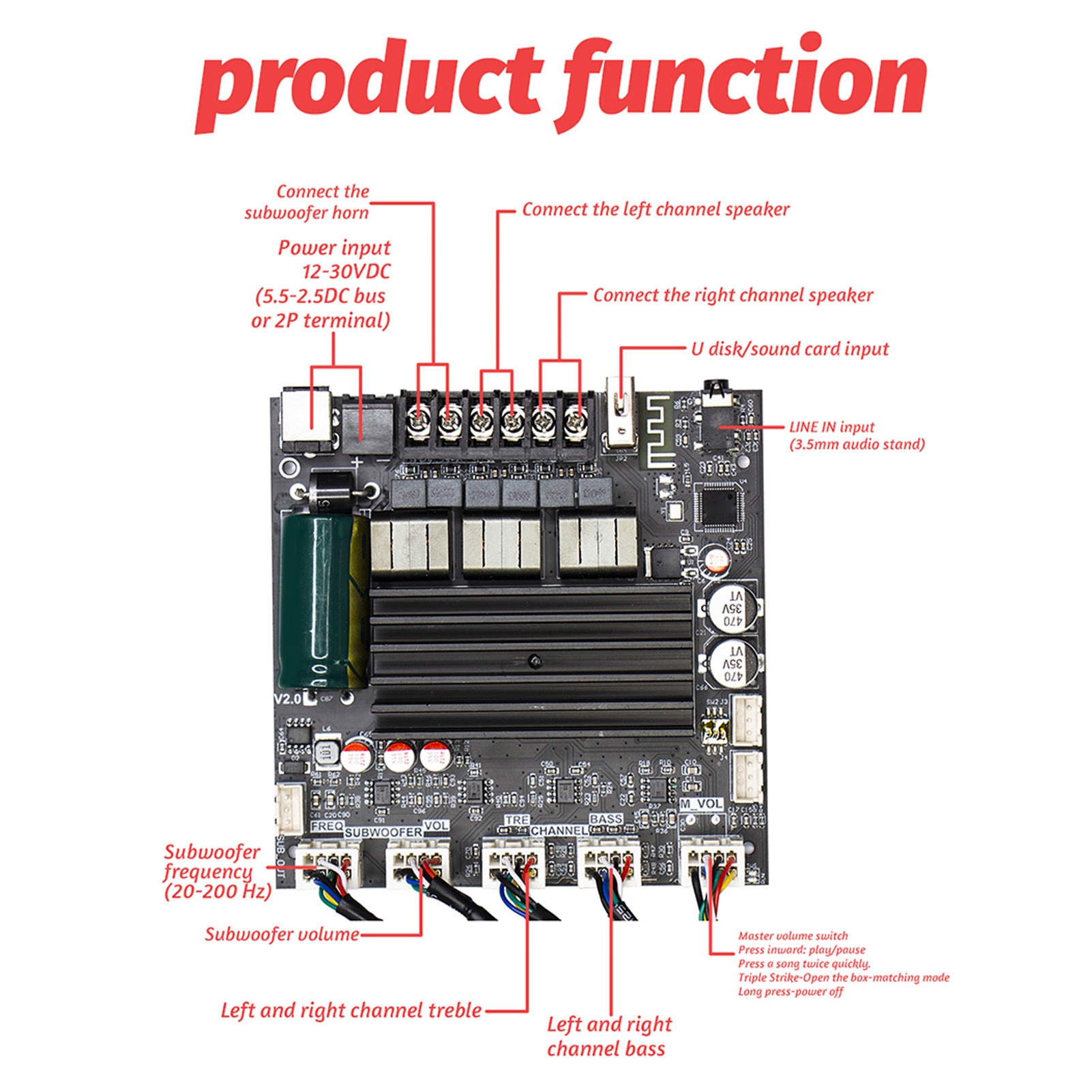 1. Висока вихідна потужність: Модуль підсилювача Bluetooth забезпечує вражаючу вихідну потужність 100 Вт на канал і 200 Вт для сабвуфера, забезпечуючи потужне звучання, яке підвищує насолоду від музики та фільмів. Цей надійний вихід забезпечує чистий і динамічний звук у всіх носіях, що робить його гарним доповненням до будь-якого домашнього кінотеатру чи аудіосистеми.