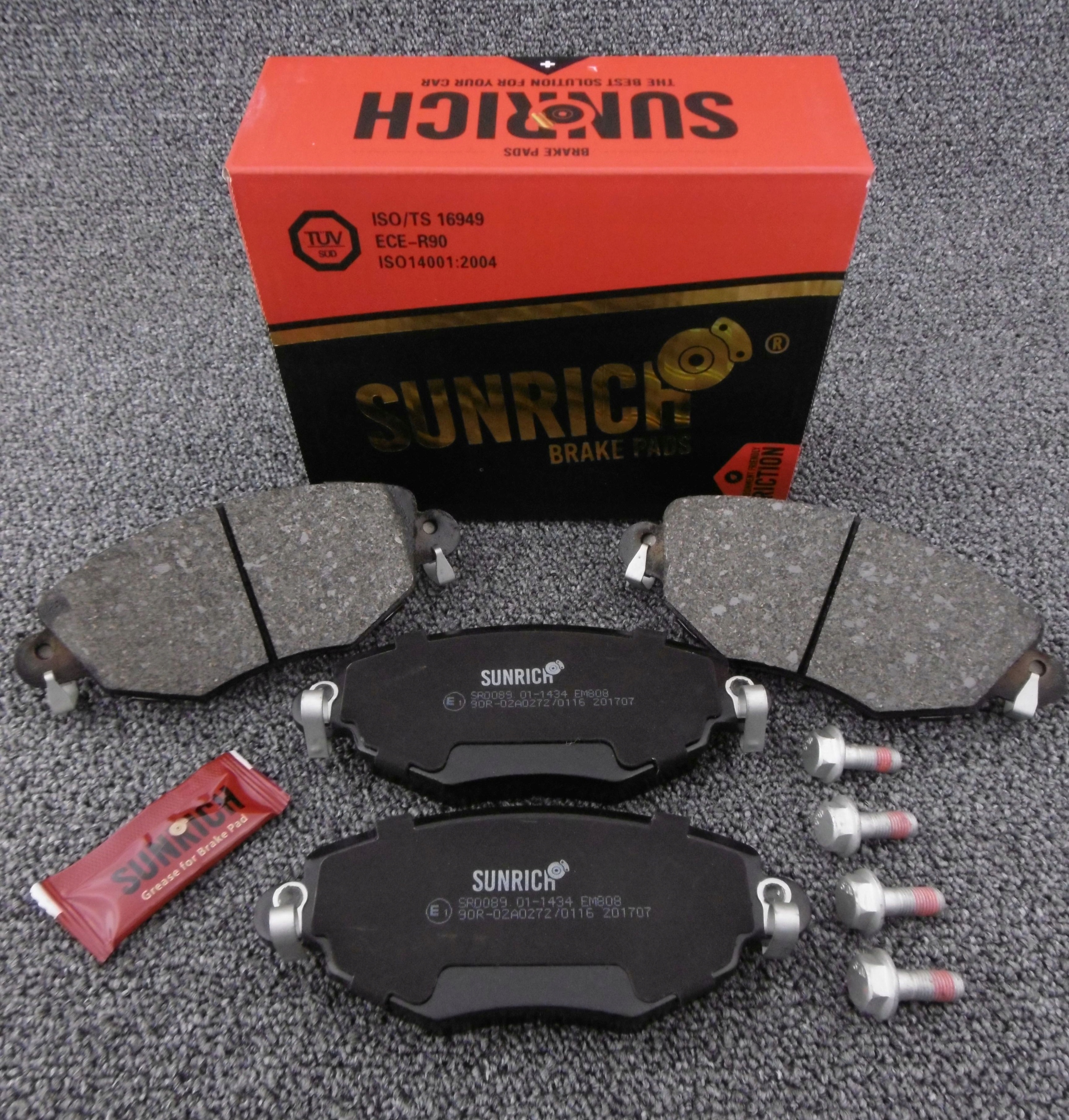 Набір (4 шт.) гальмівних колодок, оснащених антивібраційними (антискрипними) колодками, акустичними датчиками зносу (бічні пластини), гвинтами супорта та монтажним мастилом: