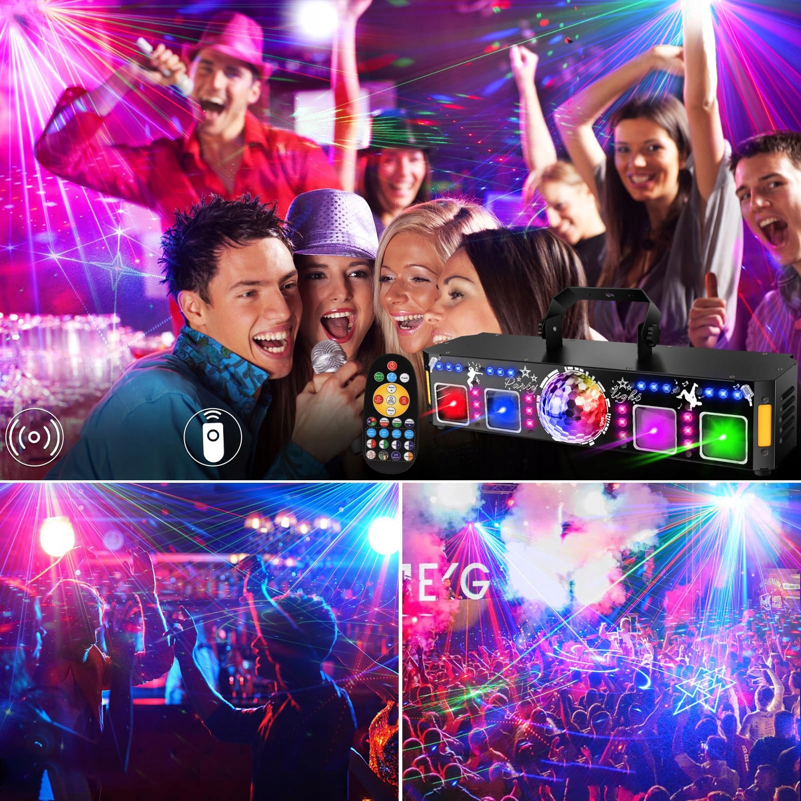 Використання 9 сильних джерел світла типу ПА "три в одному" та великі потужні світлодіоди як кольорові світильники фону, підключені в 7-кольоровому фон світла, який також може бути використаний як світлодіодний строб.