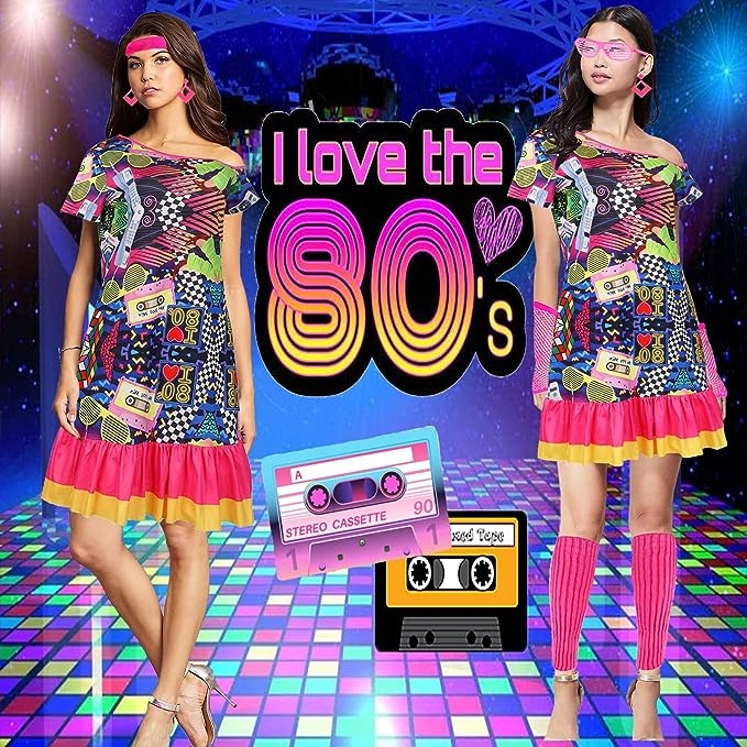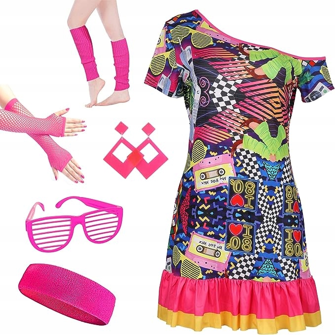 - 【Вміст упаковки】 Набір сукні для диско 80-х із 6 предметів. Ретро-сукня для диско 80-х, неонові сережки, окуляри, пов’язка на голову, рукавички в сіточку, неонові манжети.