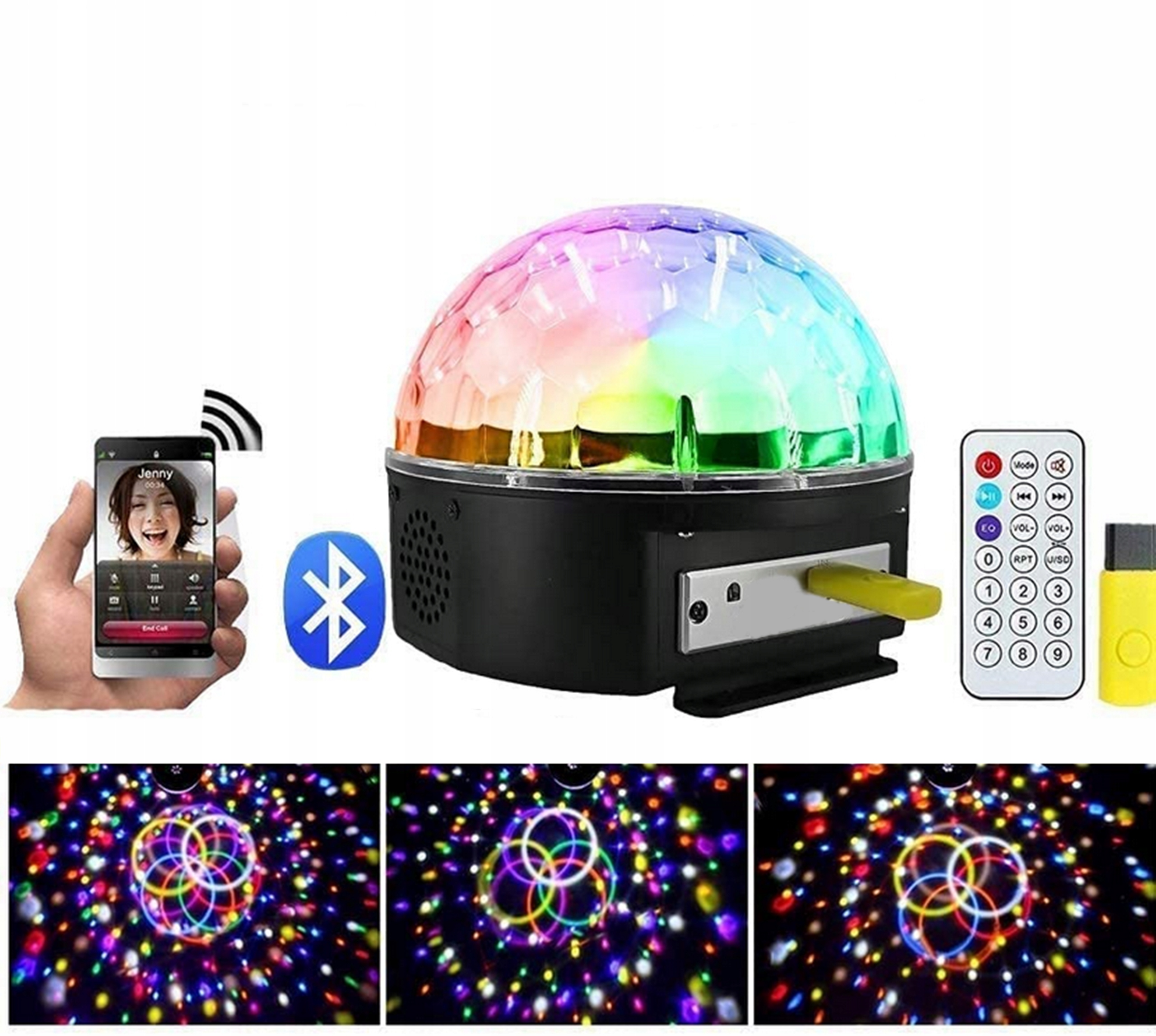 М'яч, підключений до джерела живлення, світиться без відтворення музики, випромінюючи різні візерунки. Компактний світлодіодний світловий ефект відтворює свою автоматичну програму освітлення. Створює різнокольорові дивовижні візерунки на стінах і стелі. Пульт дистанційного керування пропонує багато можливостей для налаштування візуальних ефектів. p>
