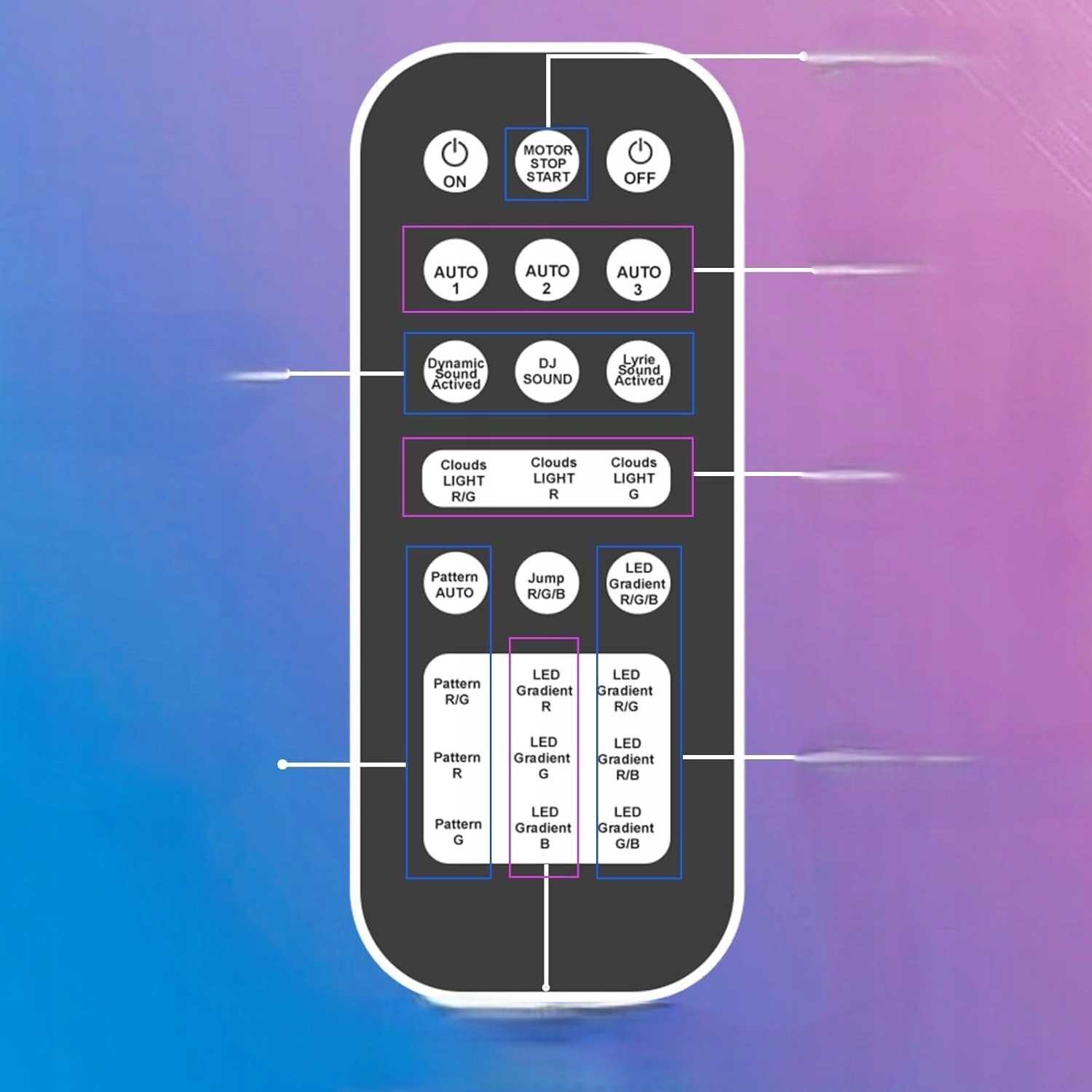 - 61 світловий ефект - комбінація 3 основних кольорів (RGB) і 2 лазерних променів (червоний і зелений), які створюють різноманітні візерунки та проекції.