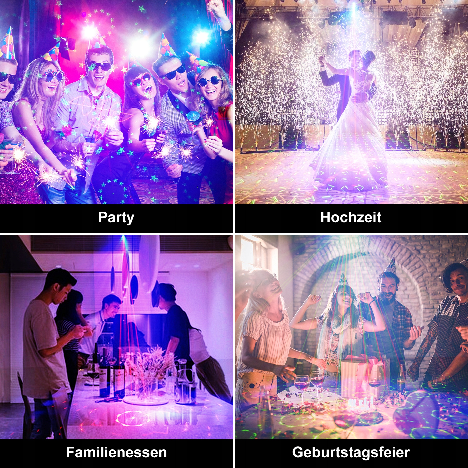 Світлодіодні ліхтарі для вечірок мають 60 різних візерунків у трьох комбінаціях світла (червоний, зелений, червоний, зелений) і сім кольорів фону (червоний, зелений, синій, жовтий, блакитний, фіолетовий і чорний). Світло та фон можна вмикати чи вимикати за бажанням. Ця комбінація кількох ефектів створює більш тривимірну атмосферу та круті сцени, а також відчуйте надзвичайні світлові ефекти!