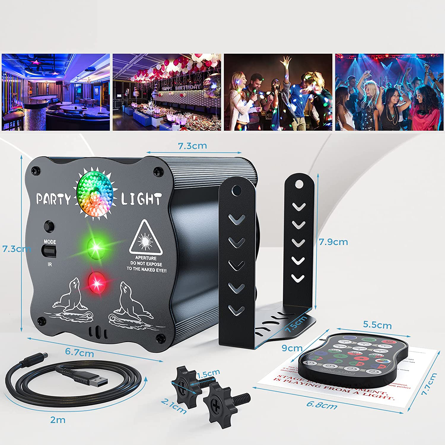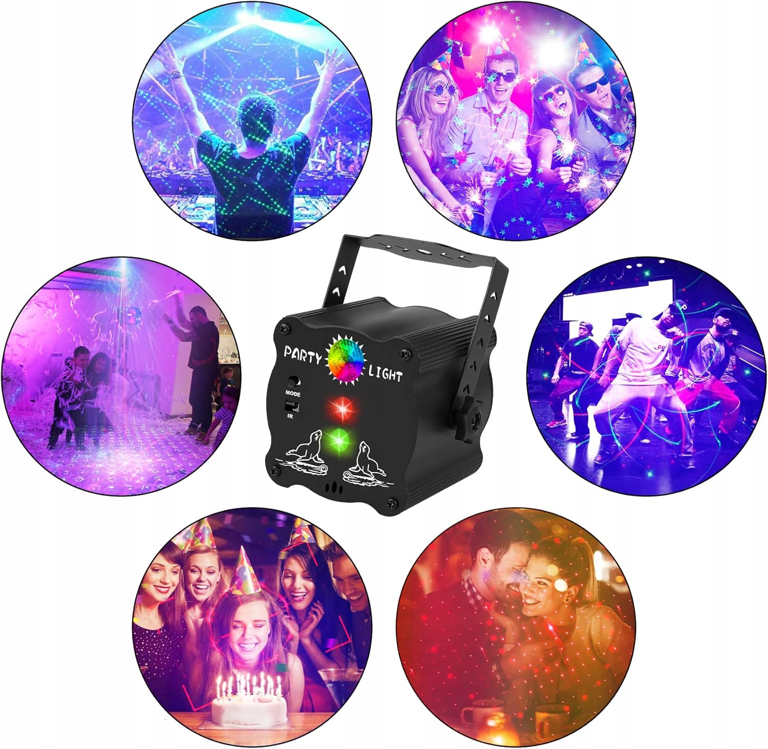 Світло на вечірці має три типи світла (червоні світильники розваг + зелені розважальні вогні + мультизореровані фонові світильники), які можна поєднувати з більш ніж 60 різними ефектами освітлення, ліхтарі партії можна переключити (6 режимів + 3 режими звуку). Завдяки ефективному датчику звуку світло можна змінити на ритм музики або плескання. Задовольнити все задоволення від вечірки.