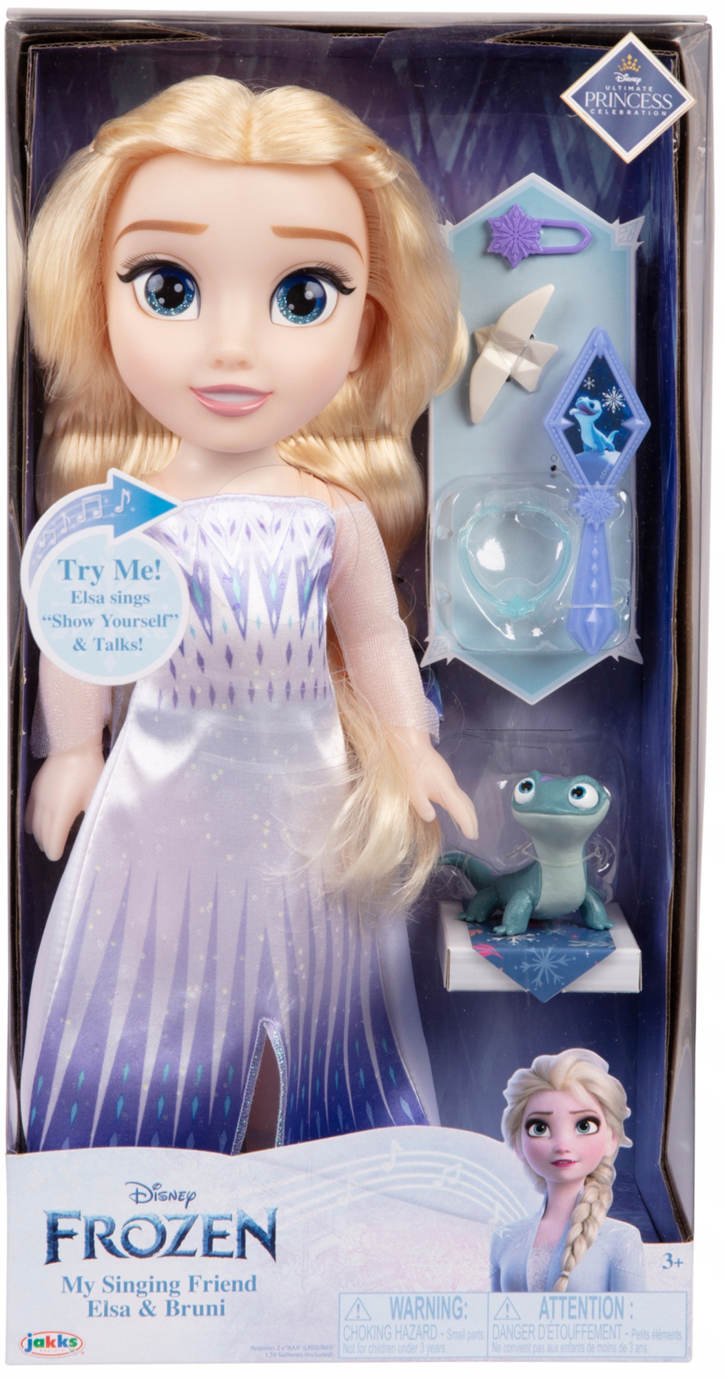 Лялька, моя одинока подруга Ельза та Бруні - це не лише співочий супутник - вона стиліст зачіски, мандрівник та найкращий друг в одній людині. Діти можуть наслідувати знакові сцени з землі льоду, створювати власні історії та співати разом. Завдяки взаємодії, лялька спонукає вас грати ролі, а приєднані аксесуари розвивають ручні навички та уяву.