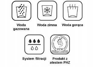 - Ефективність виробництва води (л / год): 20 (охолоджена, газована вода), 12 (гаряча вода) ), 7 (газована вода). Ефективність стосується підтримки температури нагріву/охолодження води.